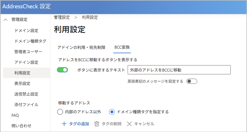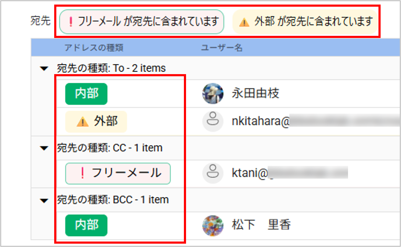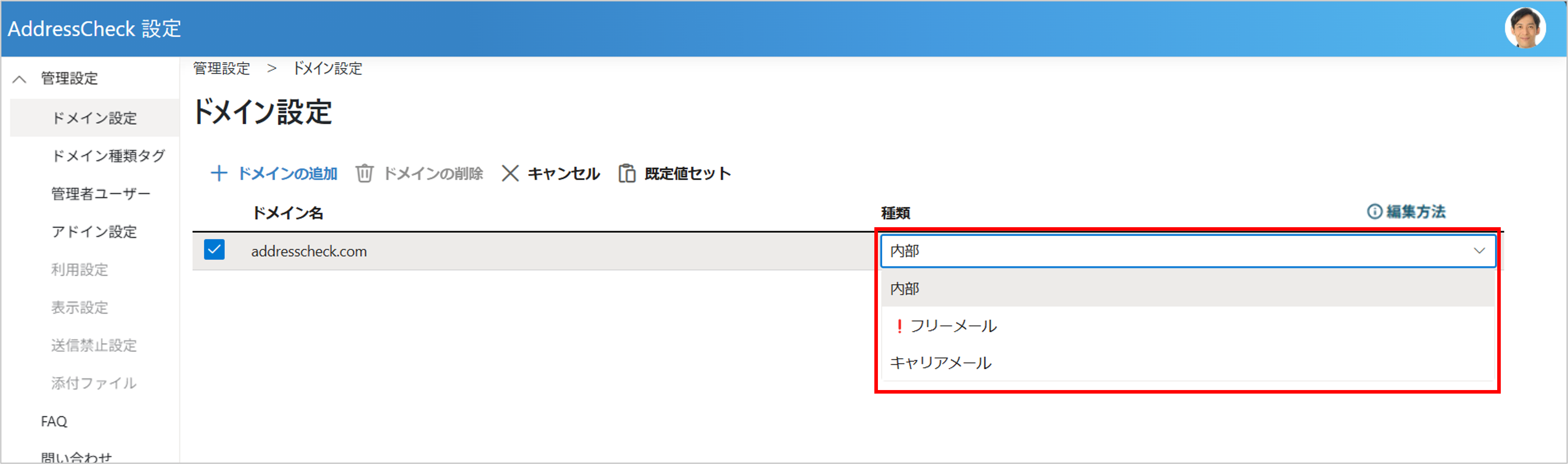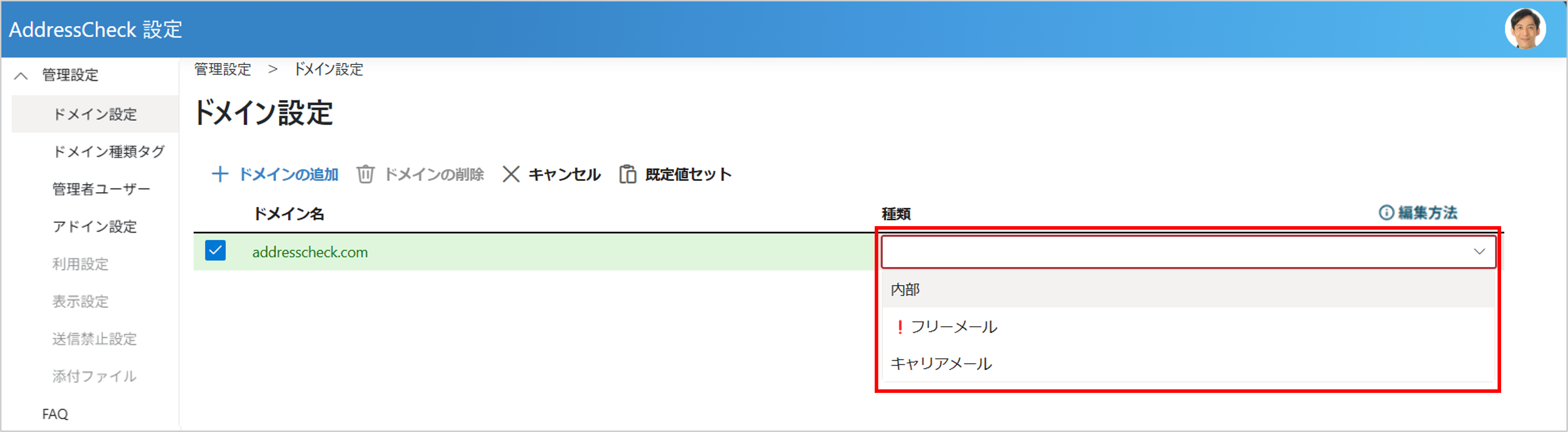 ドメインの種類を登録することにより、メール送信時にAddressCheckの画面でアドレスの種類を確認することができます。