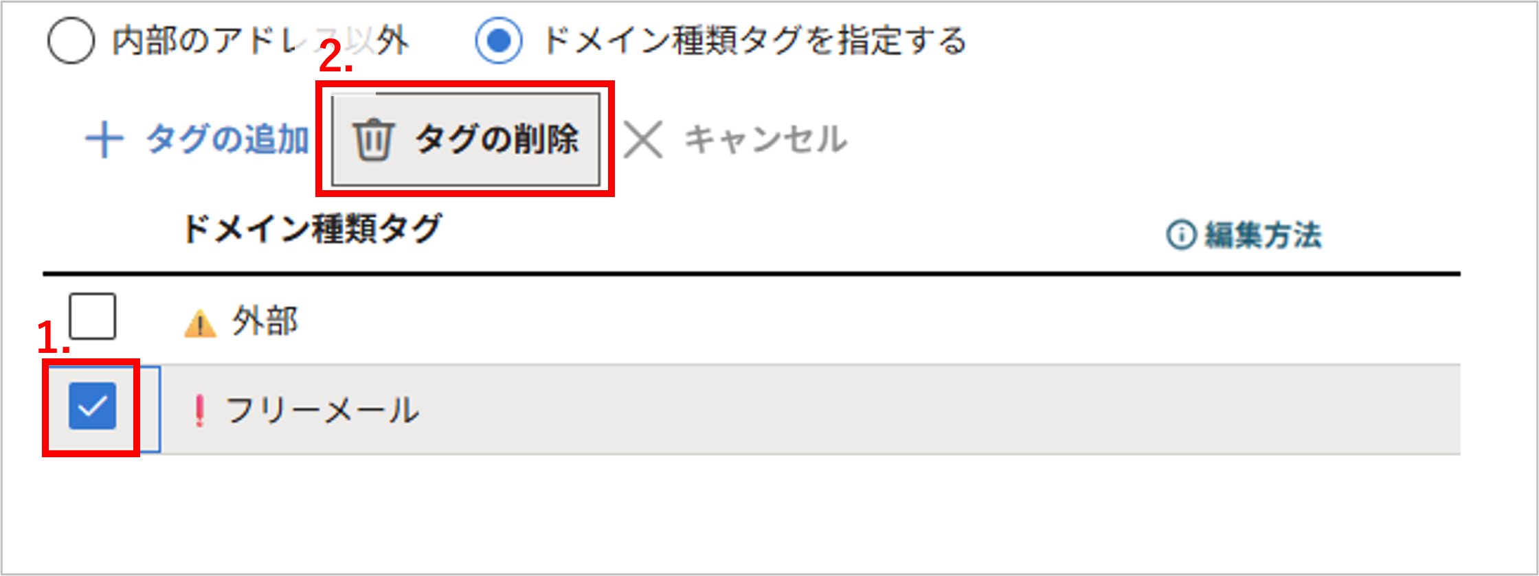 - 削除するドメイン種類タグのチェックボックスをクリックし、選択します。