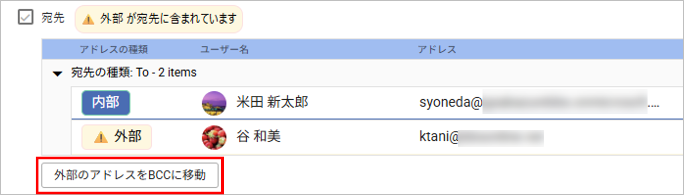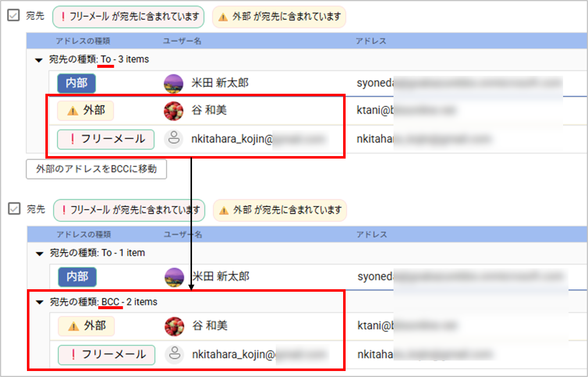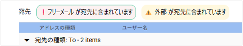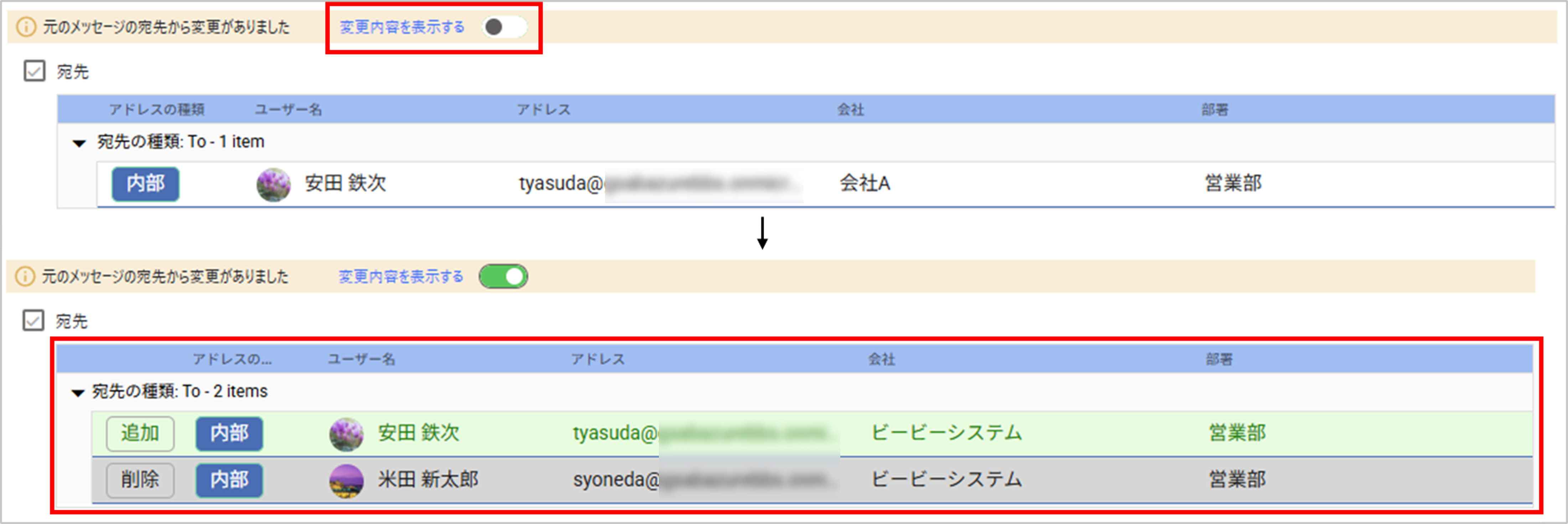 返信または全員返信時に宛先が変更されている場合、AddressCheckの画面に警告メッセージが表示されます。「変更内容を表示する」のトグルを有効にすると、変更した宛先が確認できます。