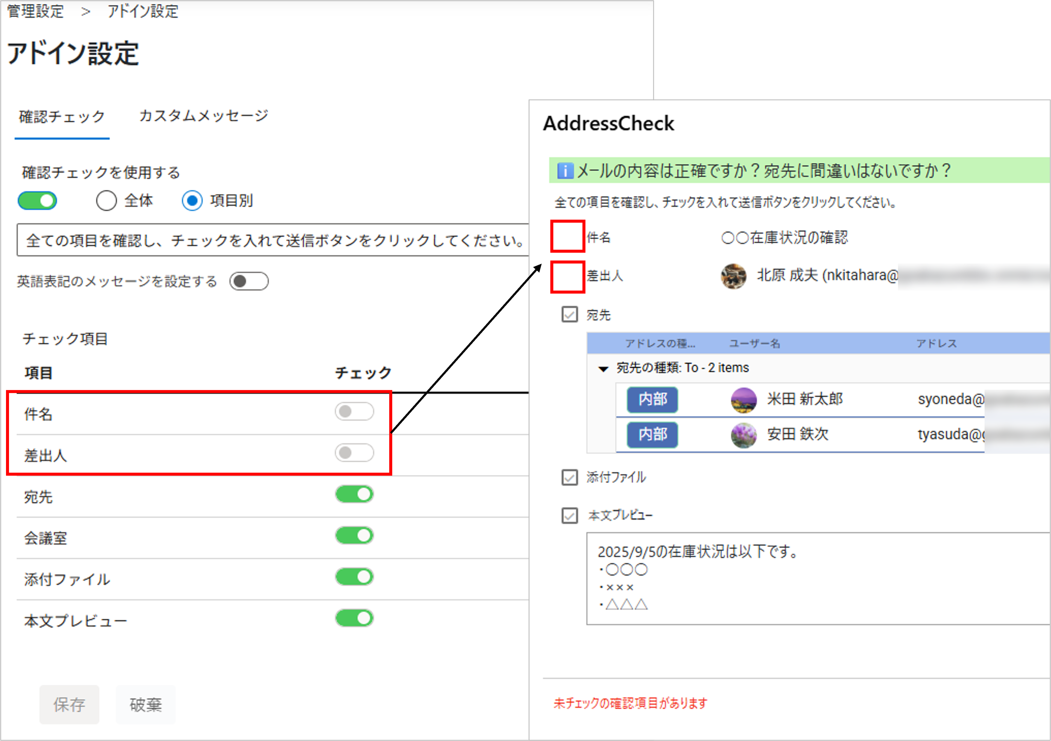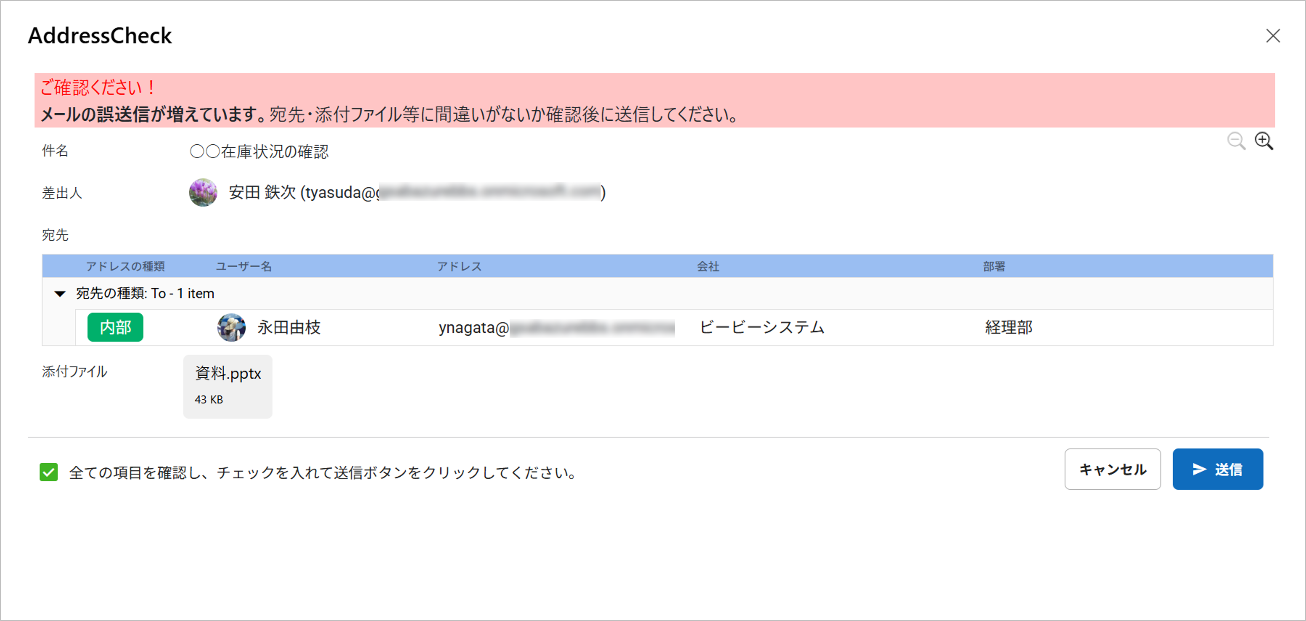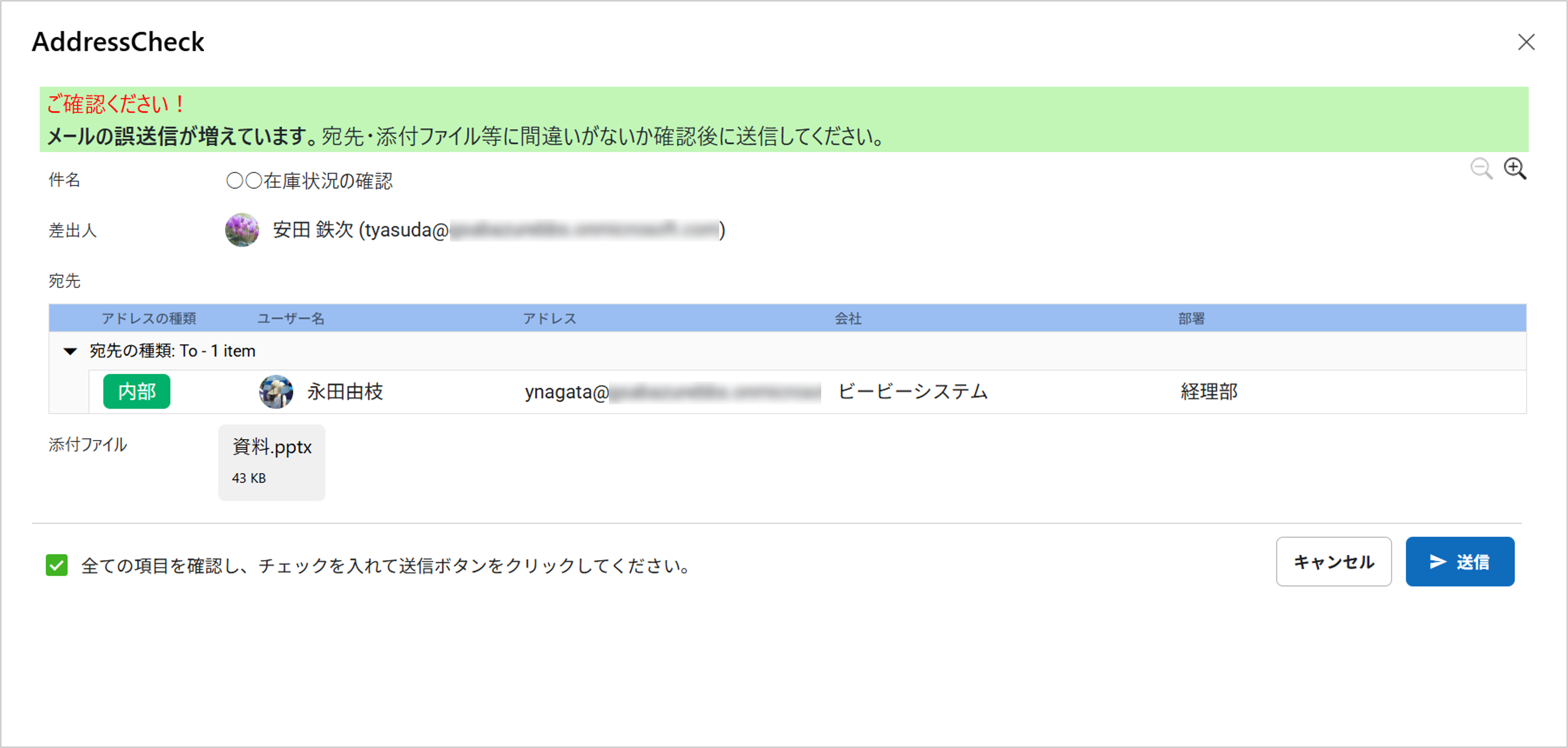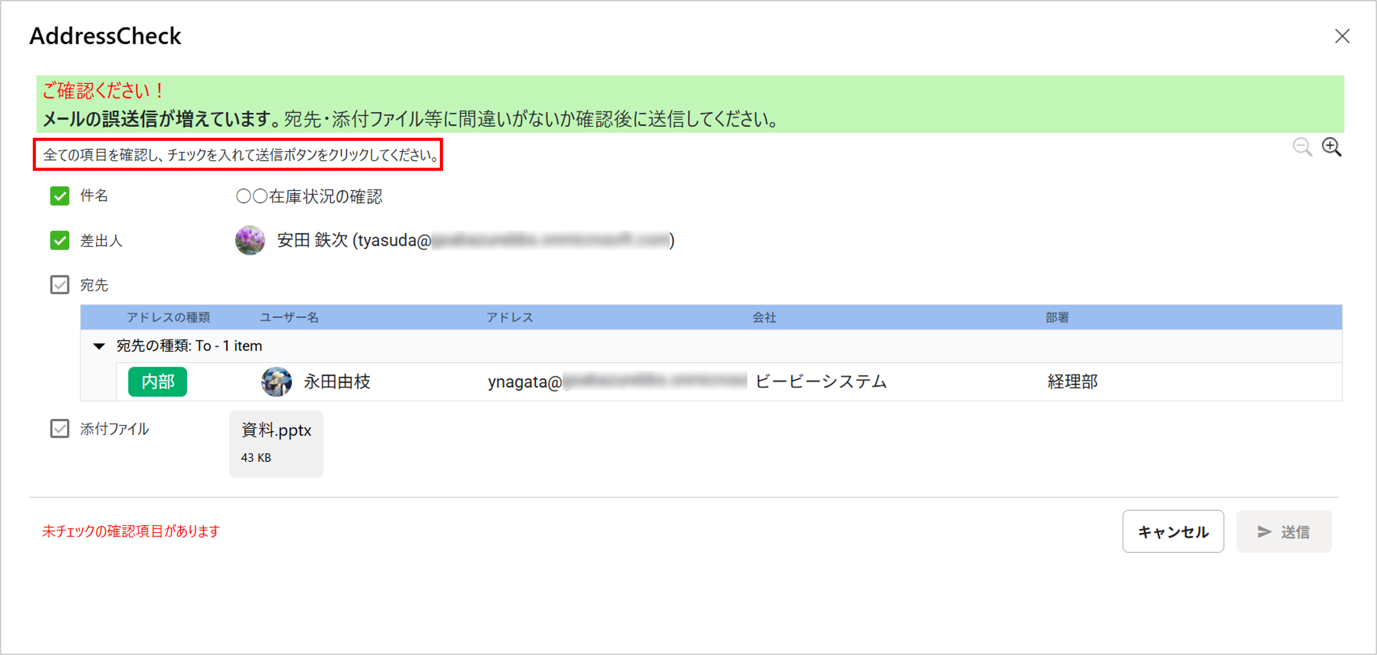 メール送信時にAddressCheckアドインが起動し、AddressCheckの画面が表示されます。 - 無効: