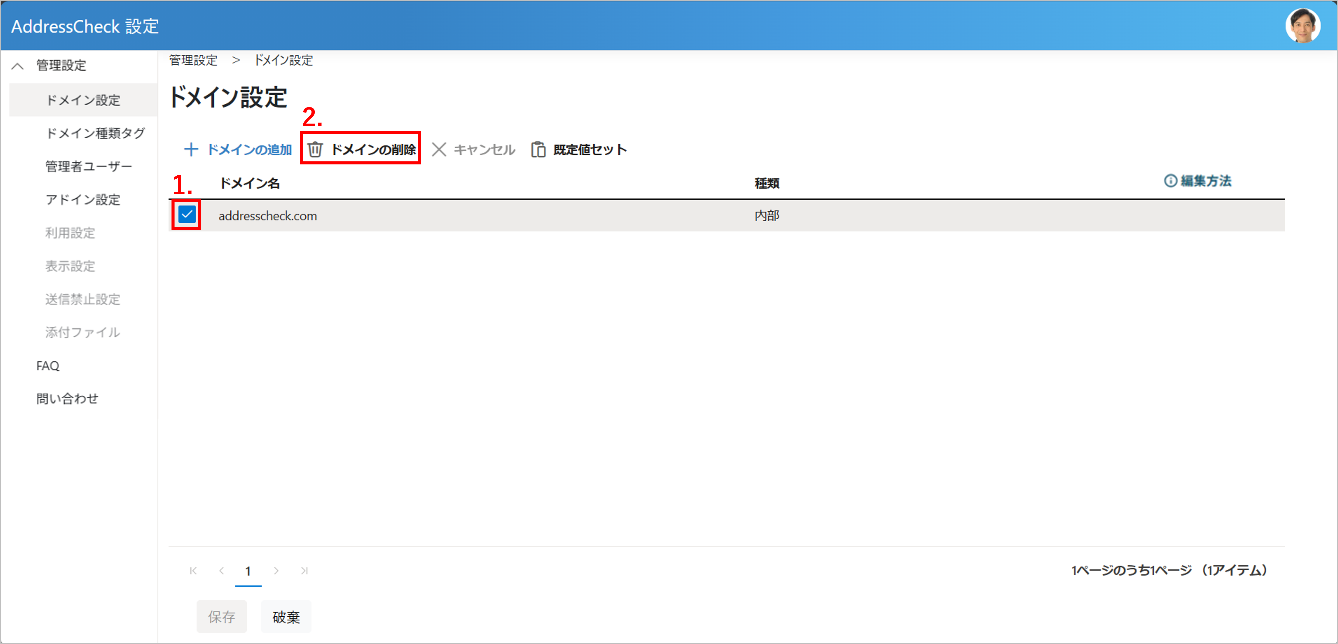 - 削除するドメインのチェックボックスをクリックし、選択します。