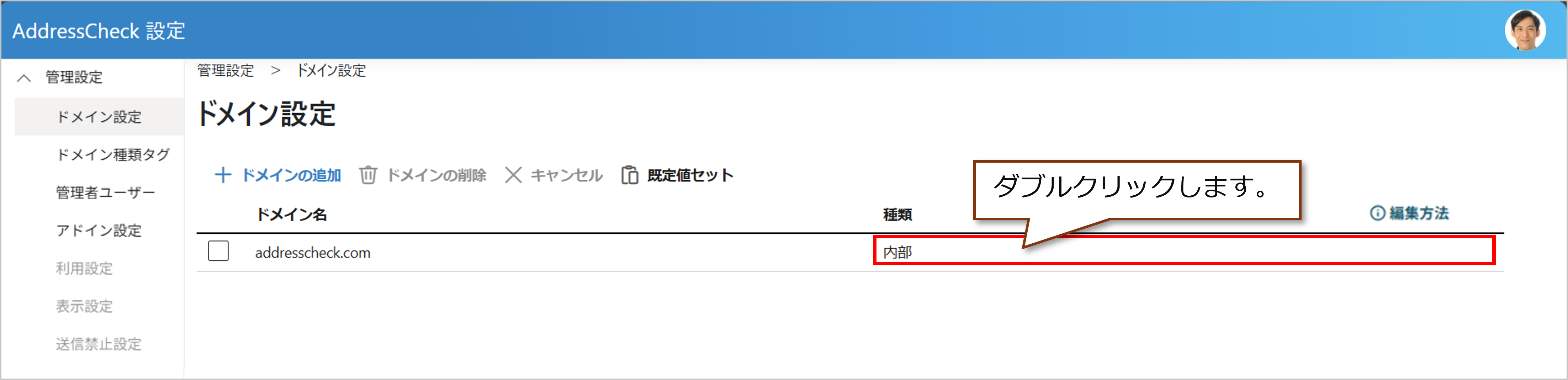 - 編集するドメインの行にある「種類」の部分をダブルクリックします。