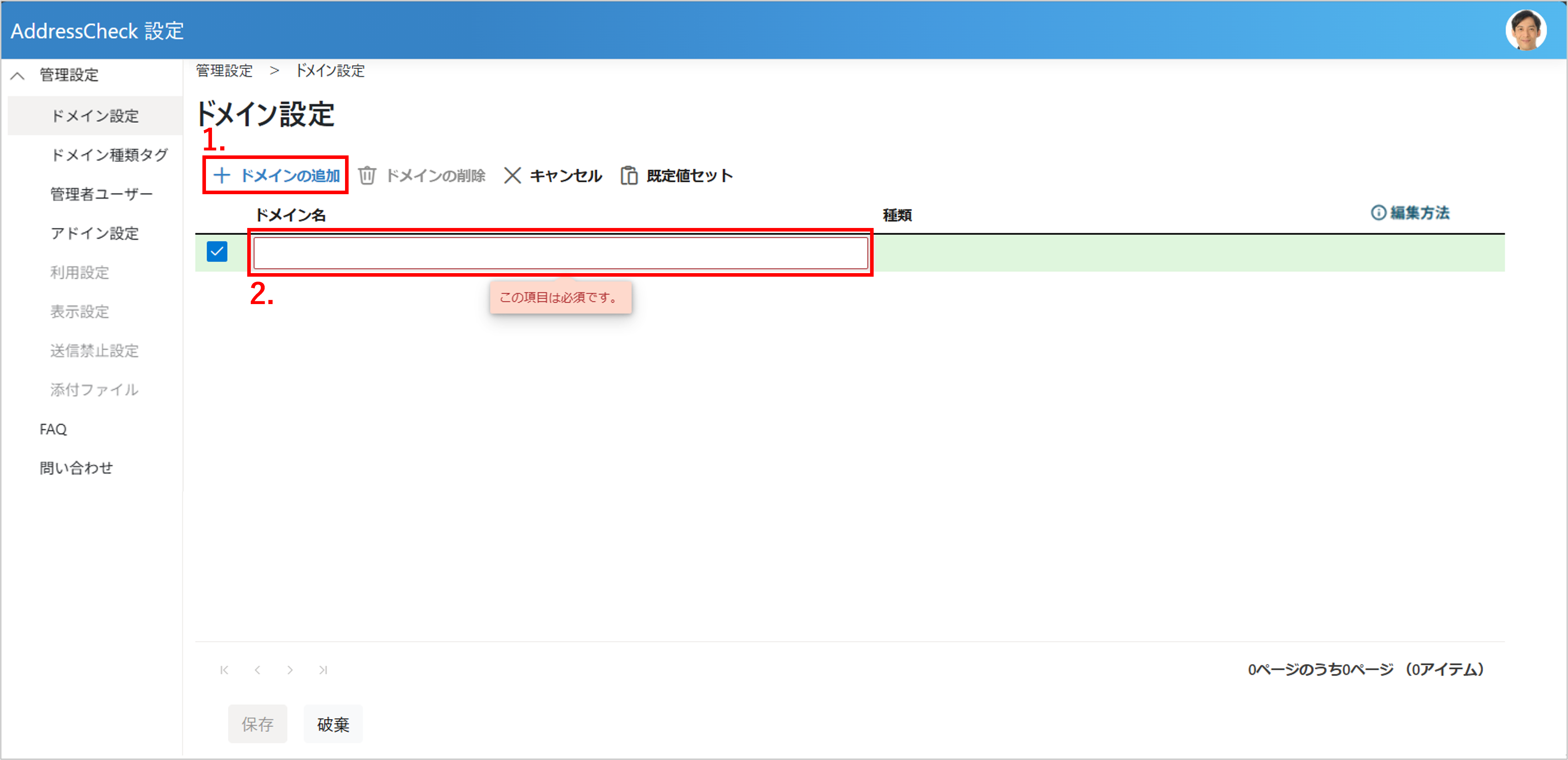 - ドメイン追加用の行が表示されますので、ドメイン名を入力します。(最大50文字)