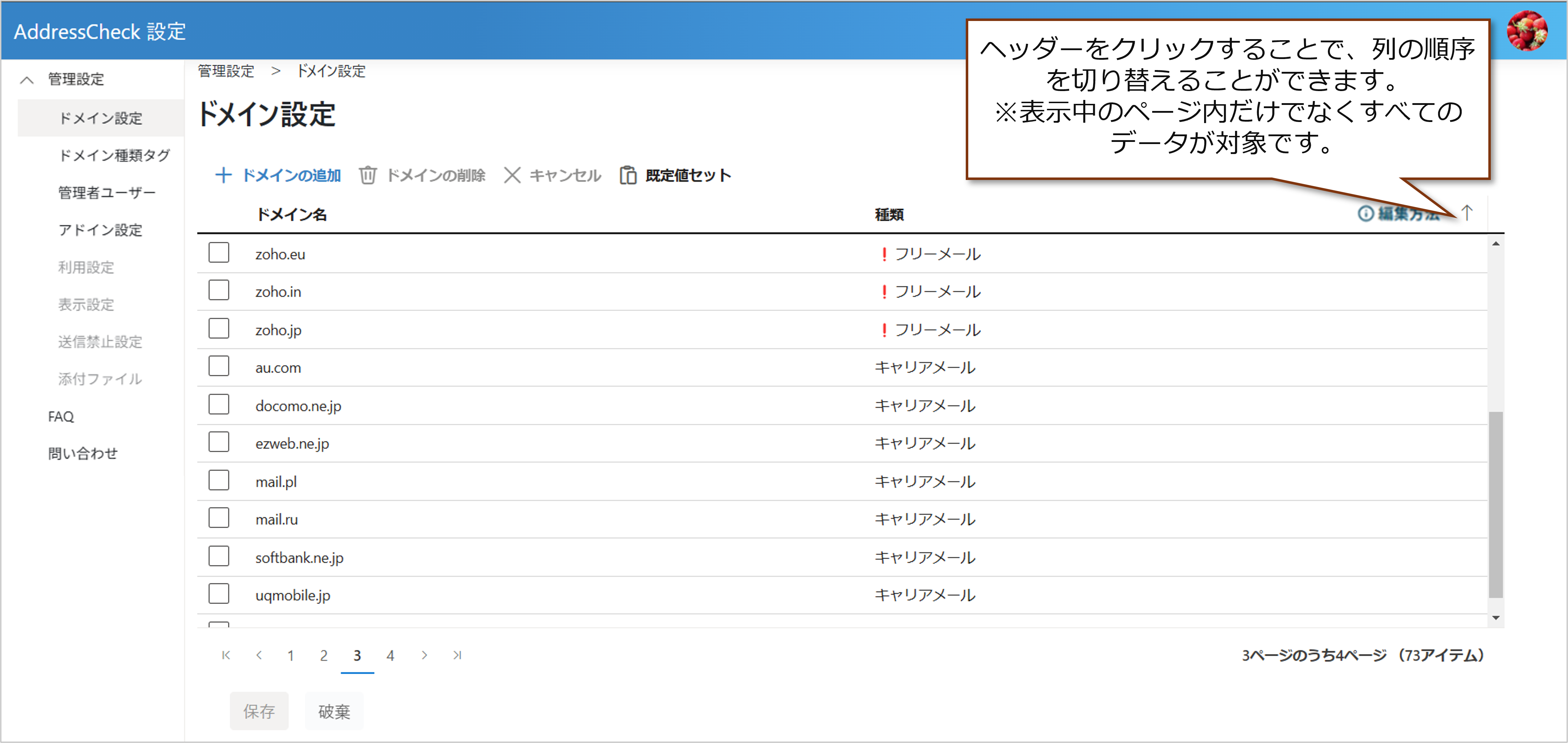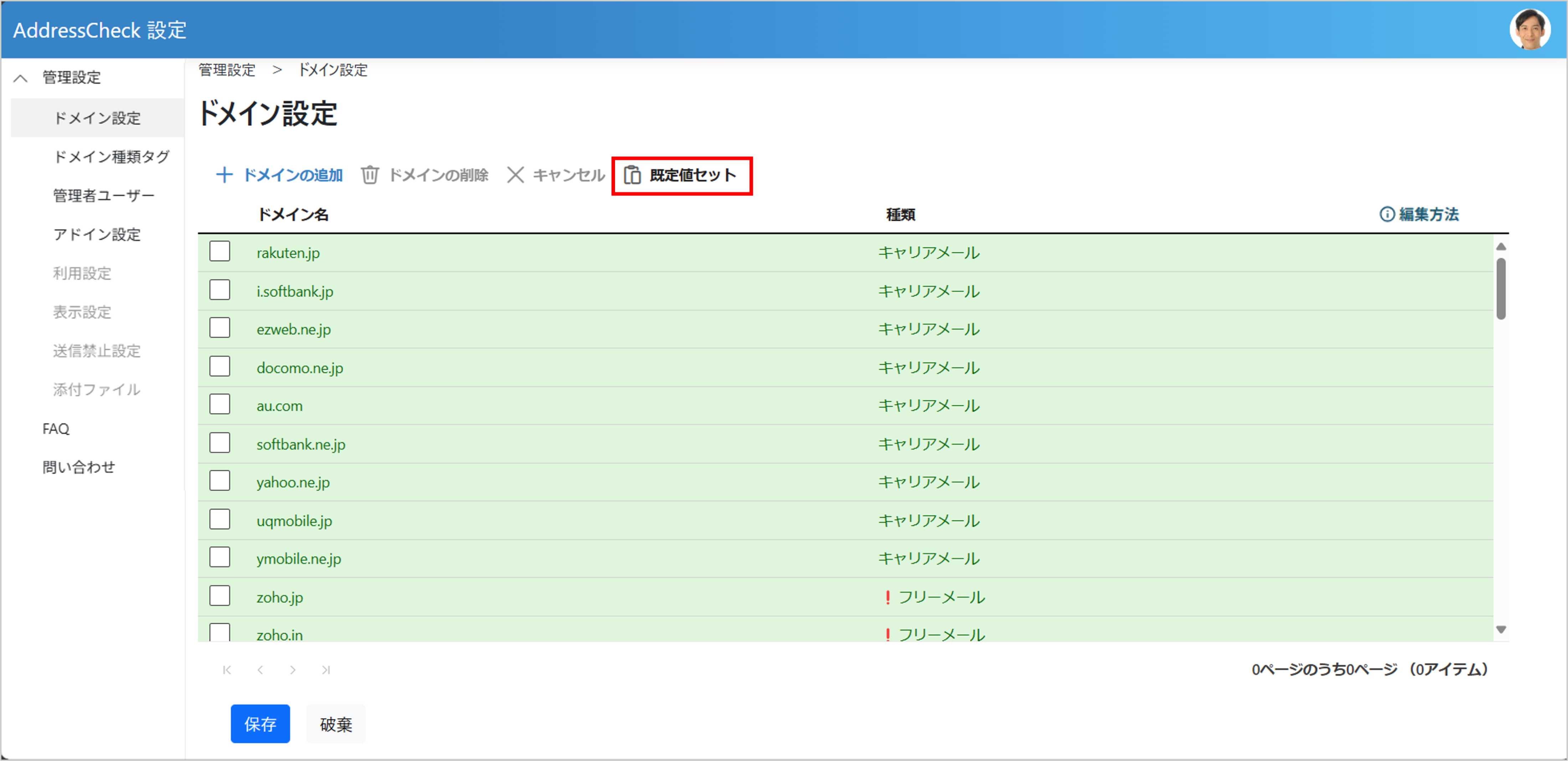 | キャリアメールのドメイン | キャリアメールのドメインを追加します。 ドメインの種類は「キャリアメール」に設定されます。 |