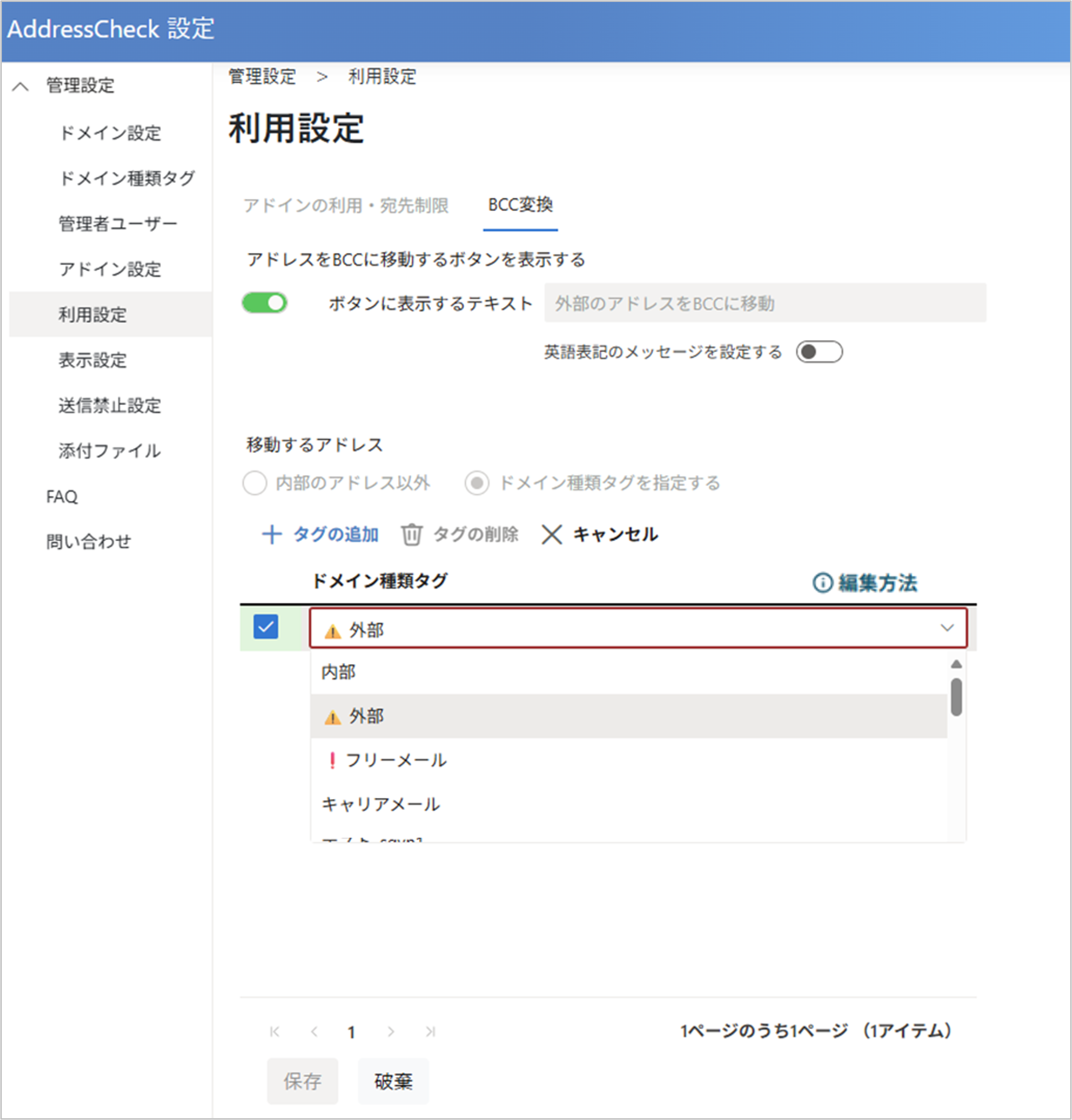 有効に設定したドメイン種類タグが送信禁止の対象になります。 - 枠外の任意の場所をクリックし、変更を確定します。