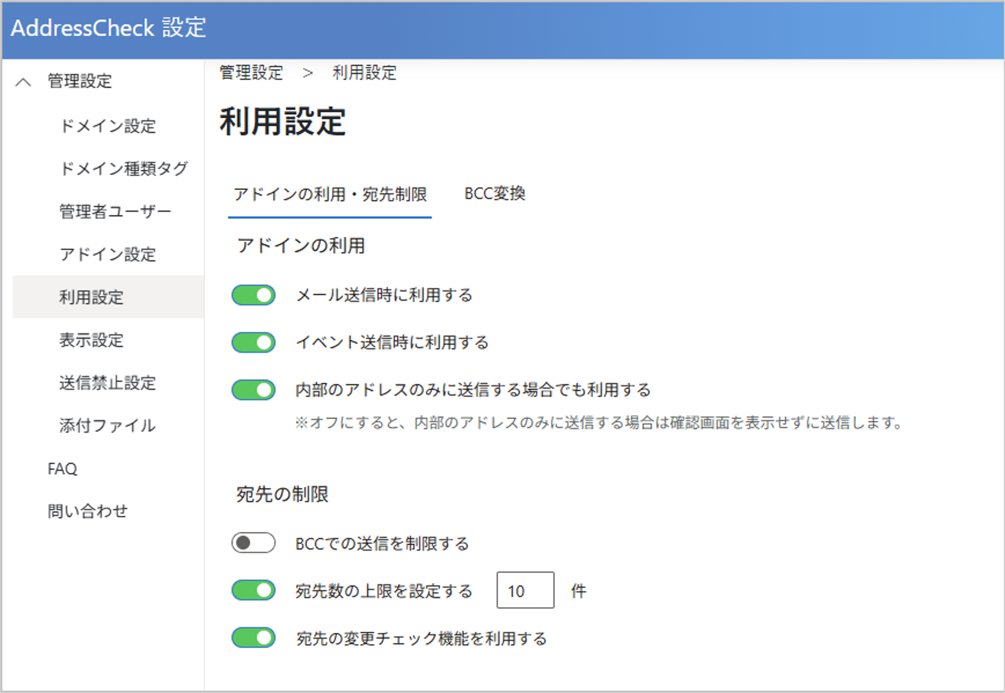 BCCに宛先が含まれているメールでも、制限なく送信できます。 - 既定値: