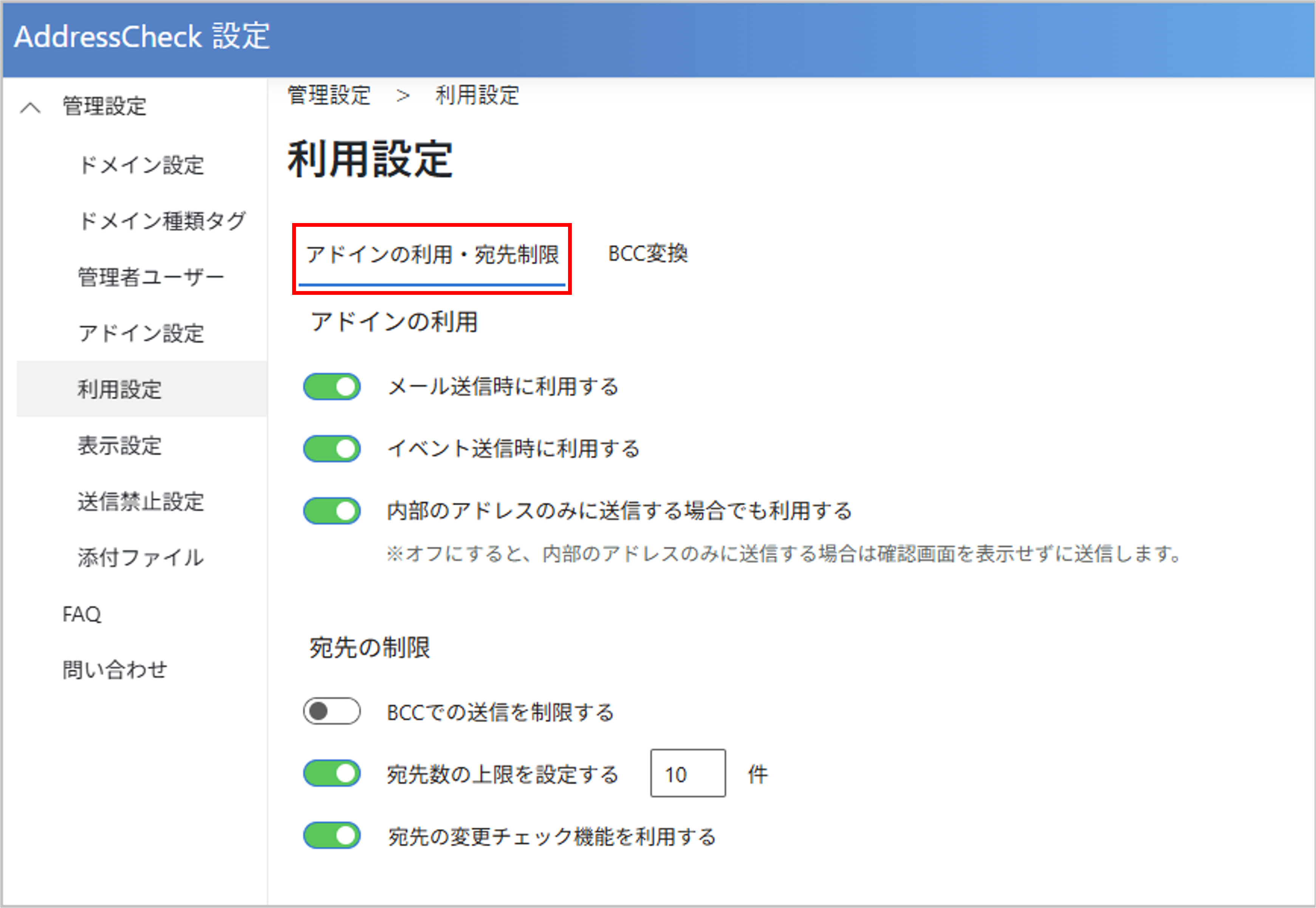 メール送信時の宛先数に上限を設定できます。設定された上限を超えると、AddressCheckの画面にエラーメッセージが表示され、送信がブロックされます。 - 無効: