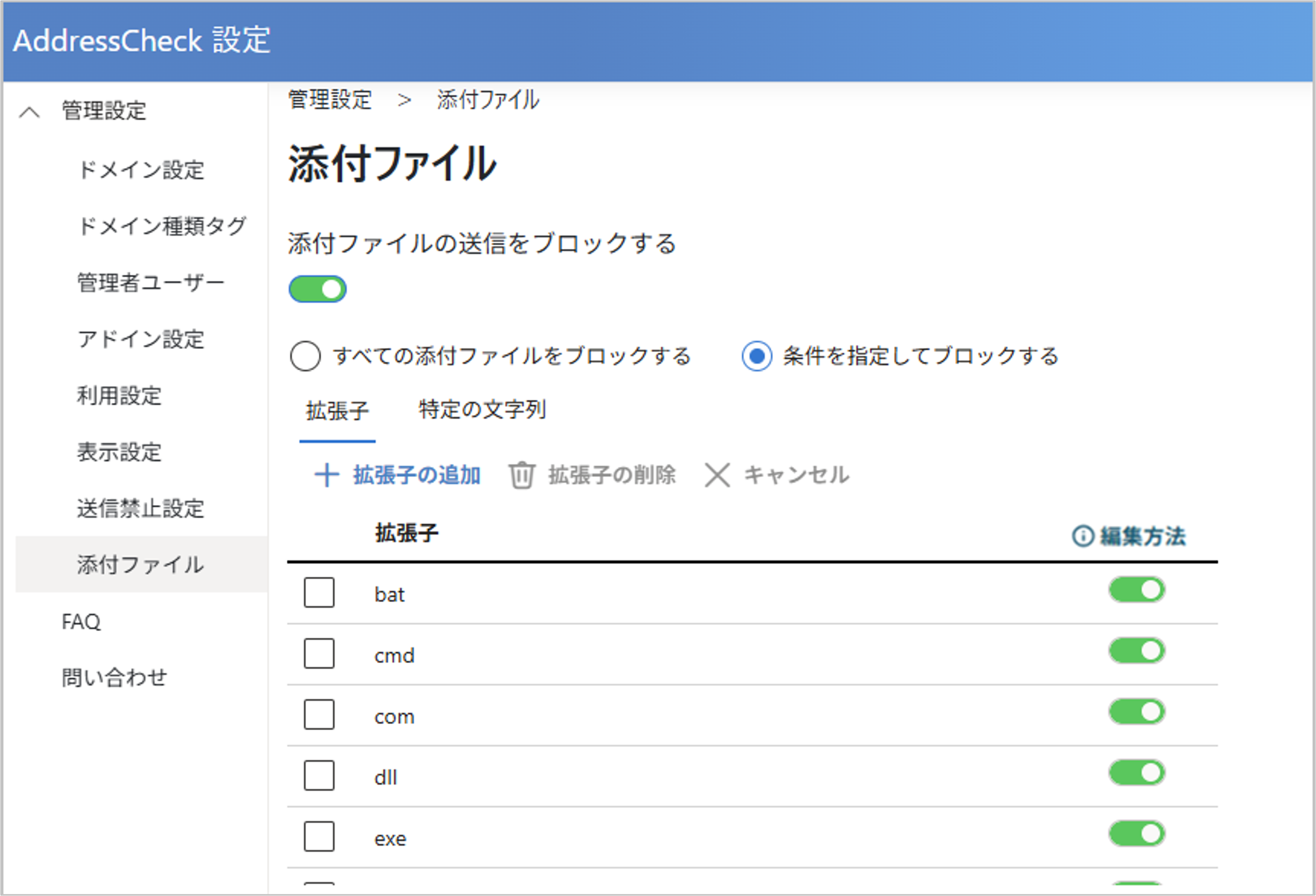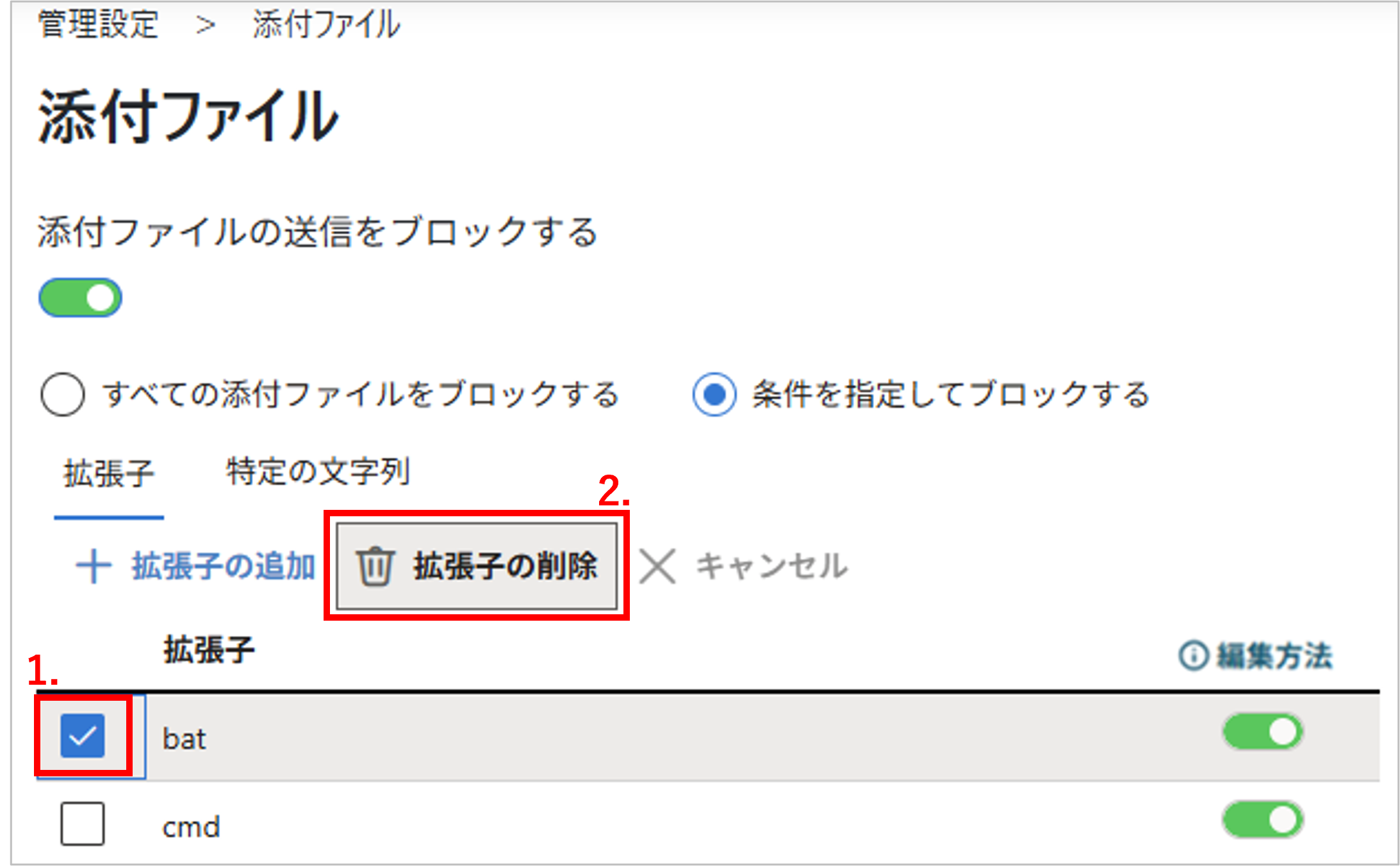 - 「すべての添付ファイルをブロックする」または「条件を指定してブロックする」を選択します。