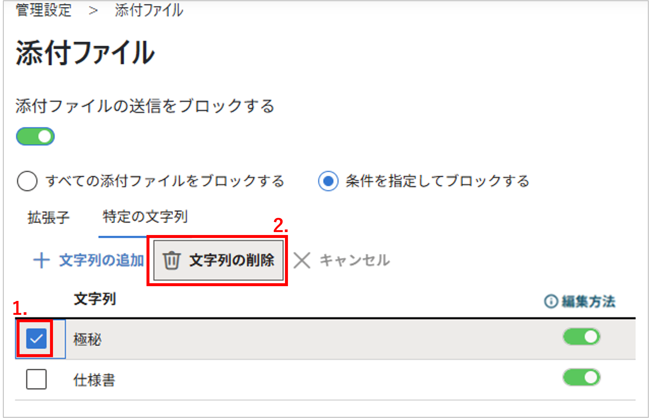 設定不要になった追加済みの「特定の文字列」は無効に設定するか、表から削除します。