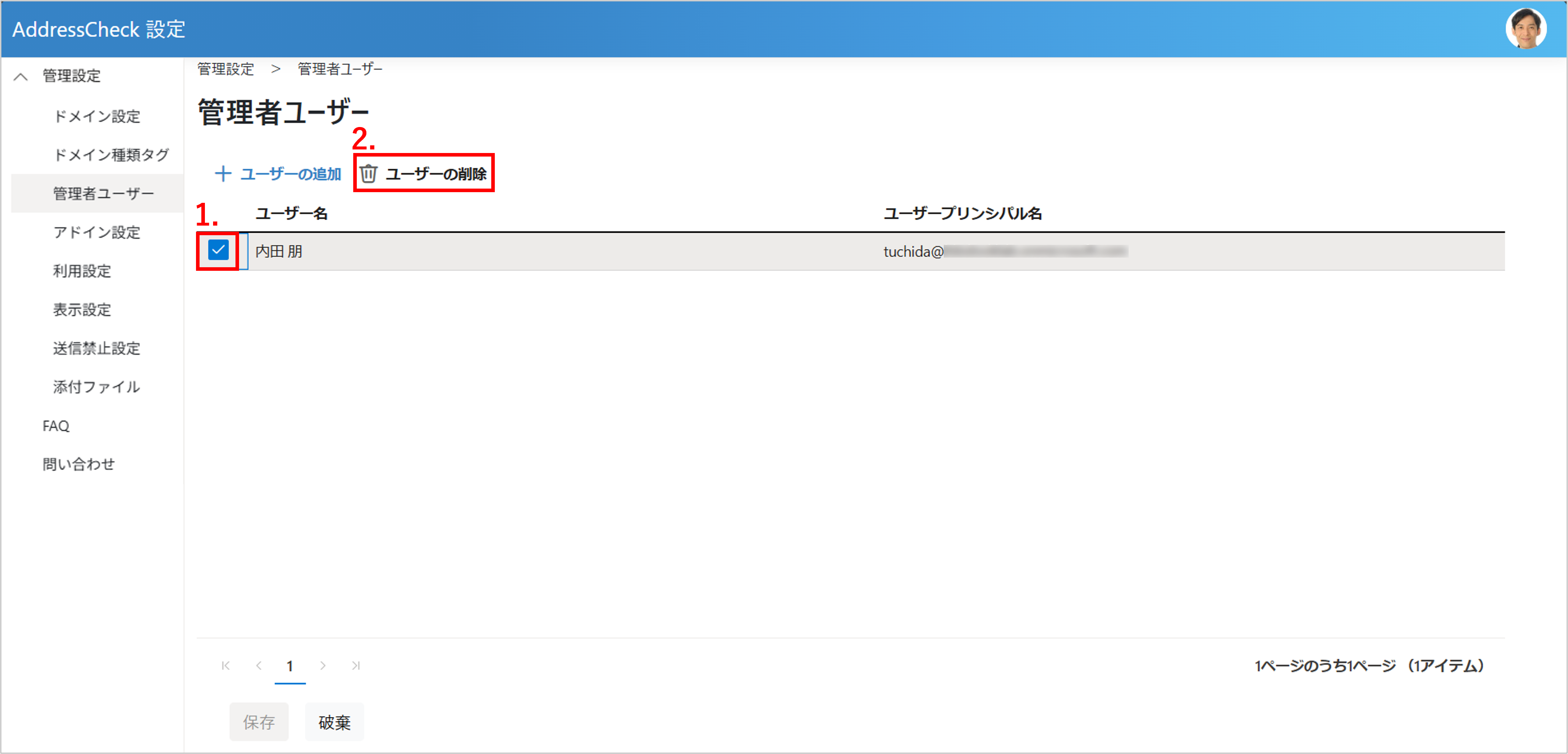 - 削除するユーザーのチェックボックスにチェックを入れます。