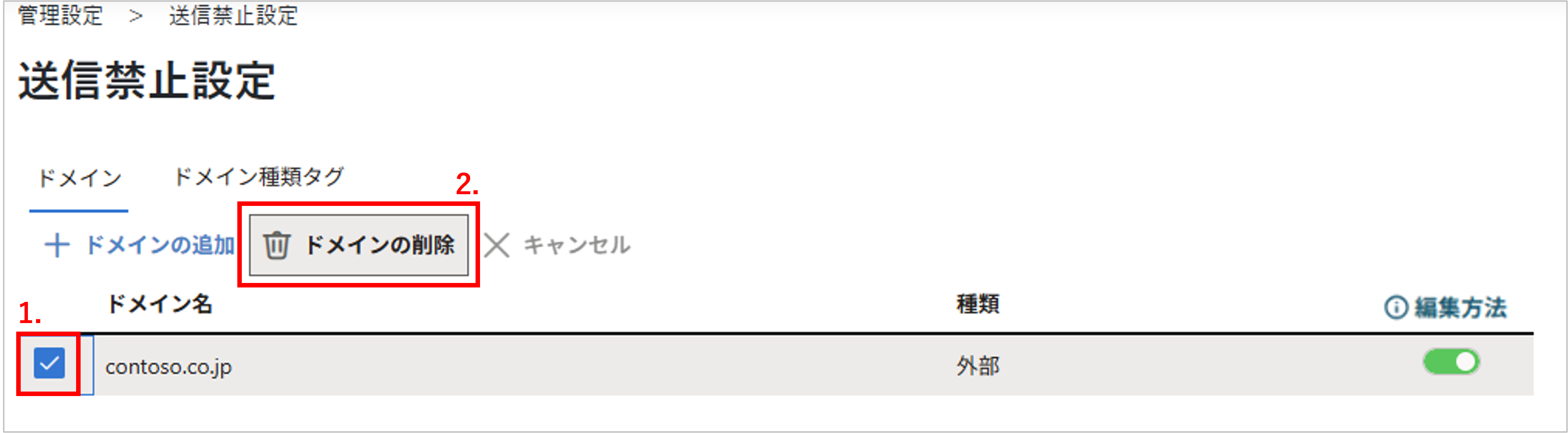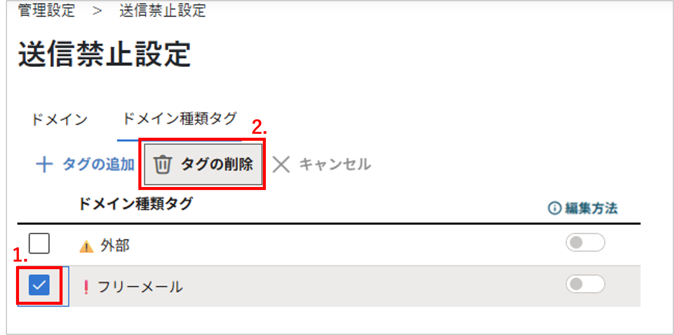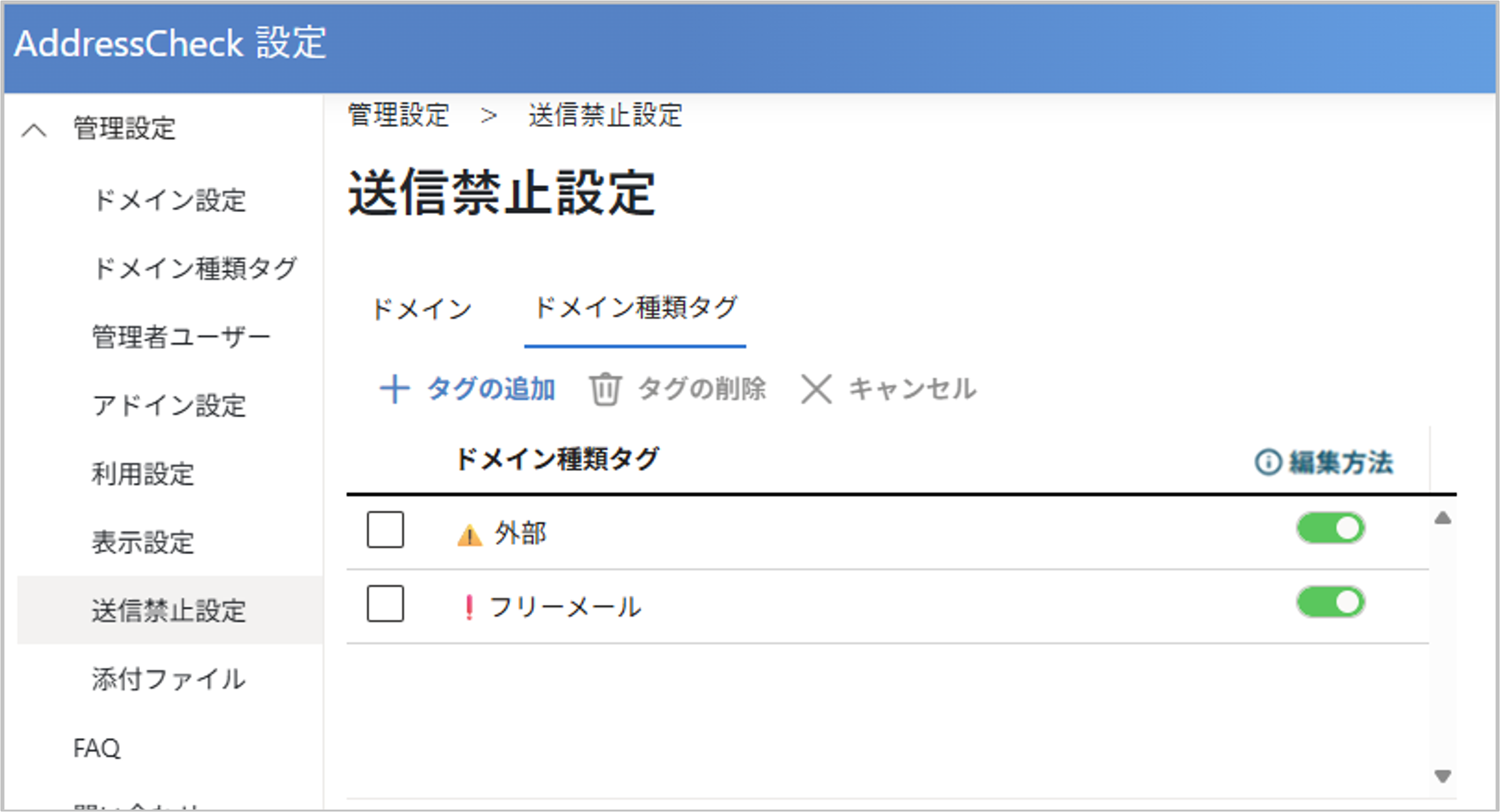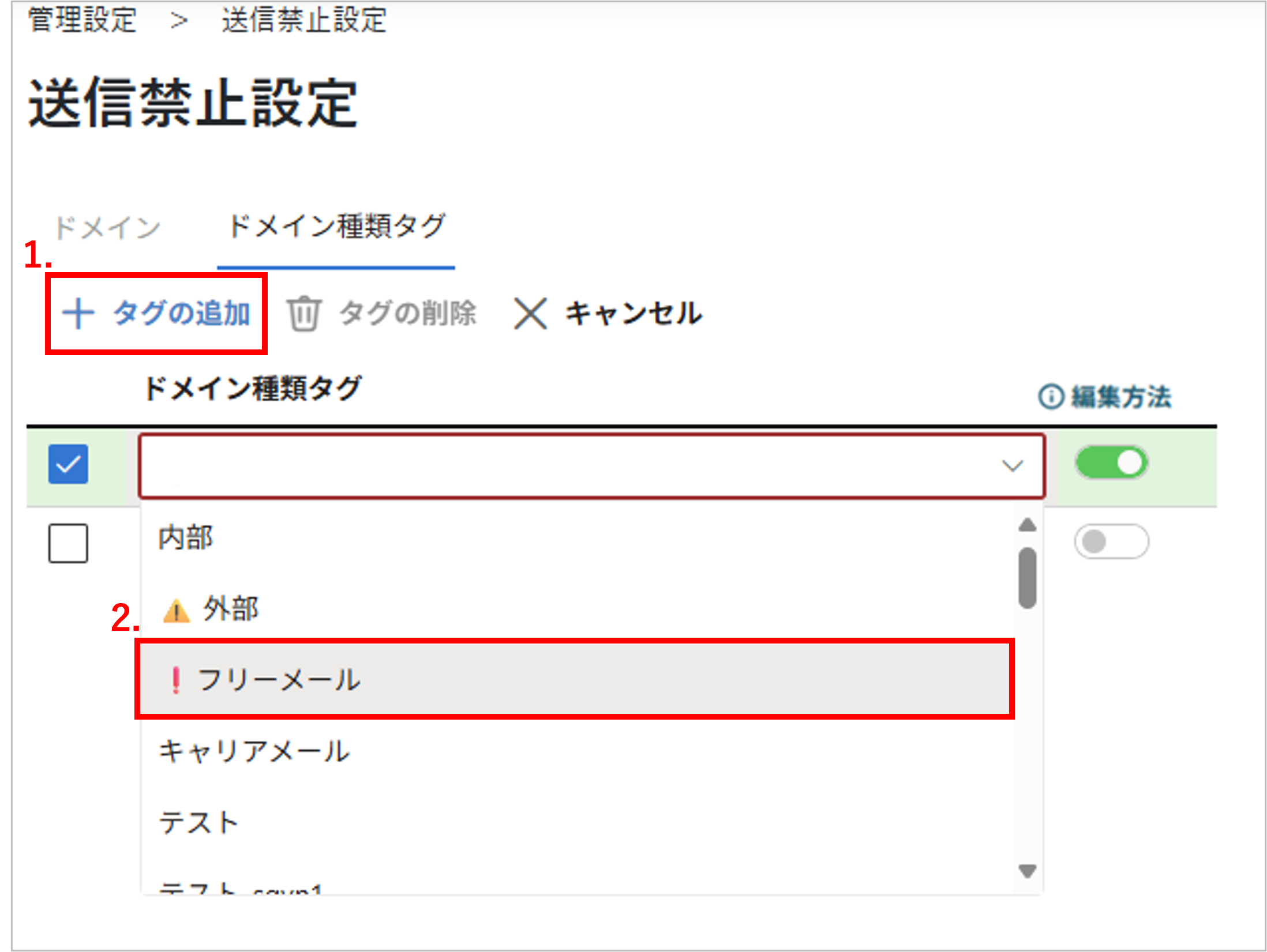有効に設定したドメイン種類タグが送信禁止の対象になります。
