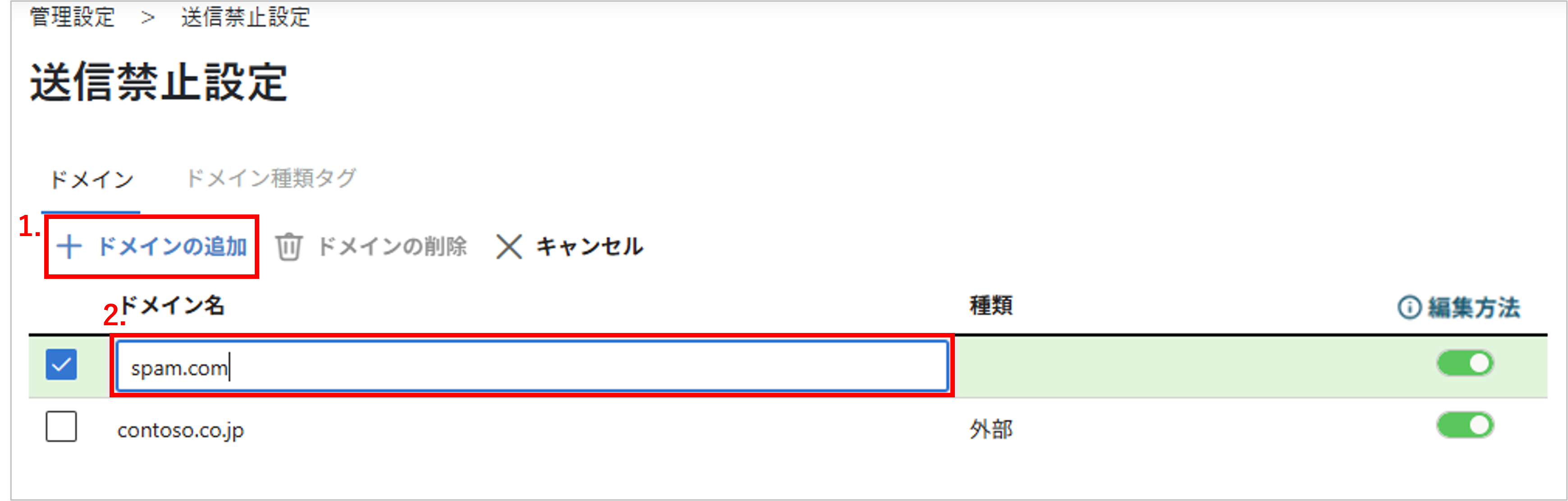 送信禁止対象のドメインを追加します。