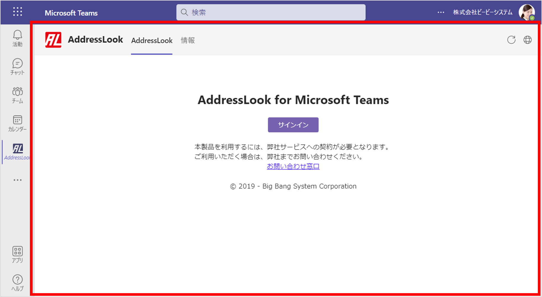「AddressLook」を選択すると、AddressLookがMicrosoft Teams上で開きます。