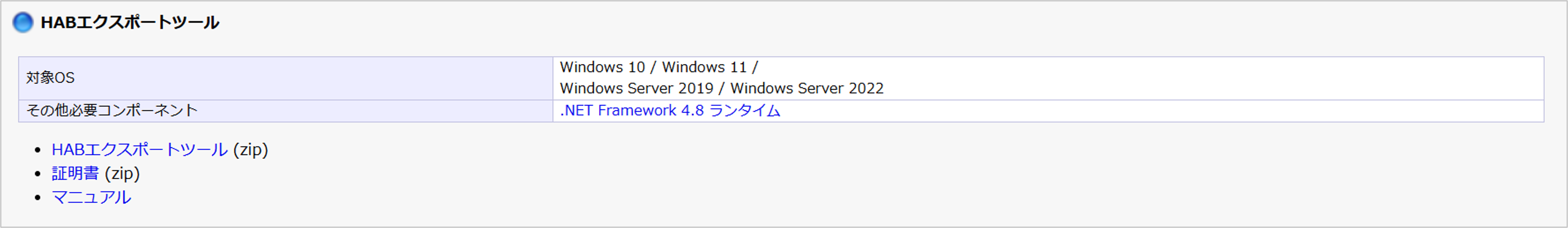 - 項目「HABエクスポートツール」内の「HABエクスポートツール」と「証明書」をクリックし、ダウンロードします。