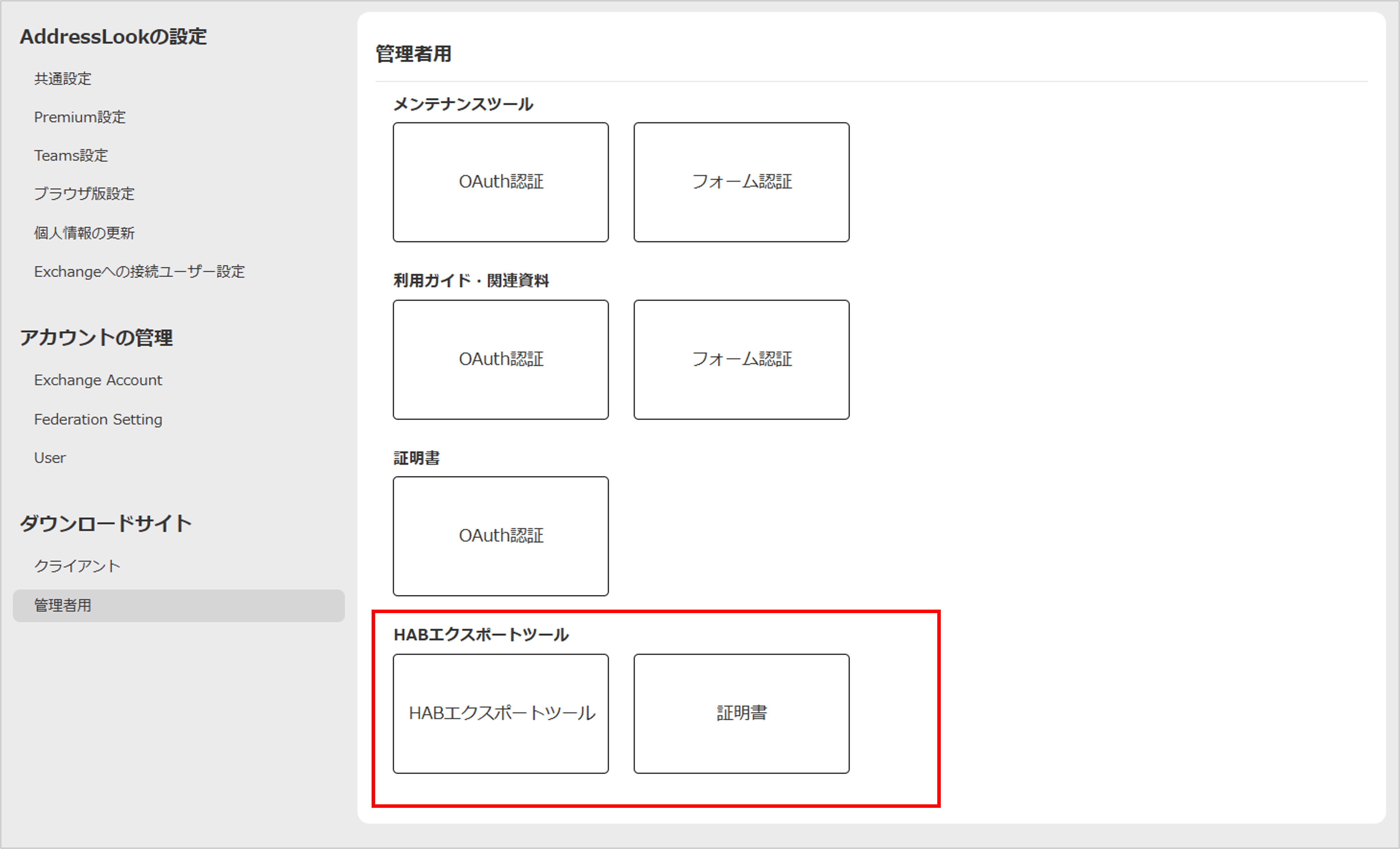 - 項目「HABエクスポートツール」内の「HABエクスポートツール」ボタンと「証明書」ボタンをクリックし、ダウンロードします。