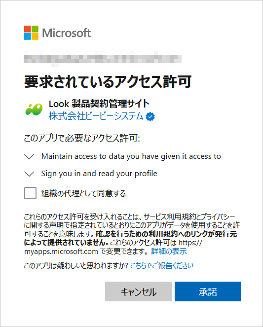 ※「アプリケーションの購入」で、IBLook for Microsoft Teamsを購入したユーザーのアカウント情報を入力してください。 - 初回設定が完了していない場合のみ、アクセス許可画面が表示されます。