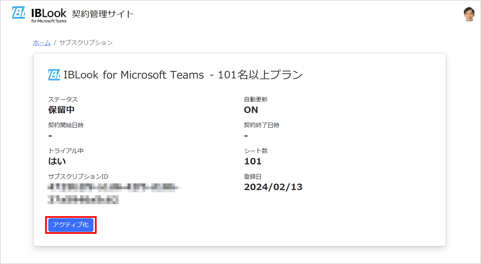 3. 「アプリケーションの購入」の手順4で紐づけたサブスクリプションの「アクティブ化」ボタンをクリックします。