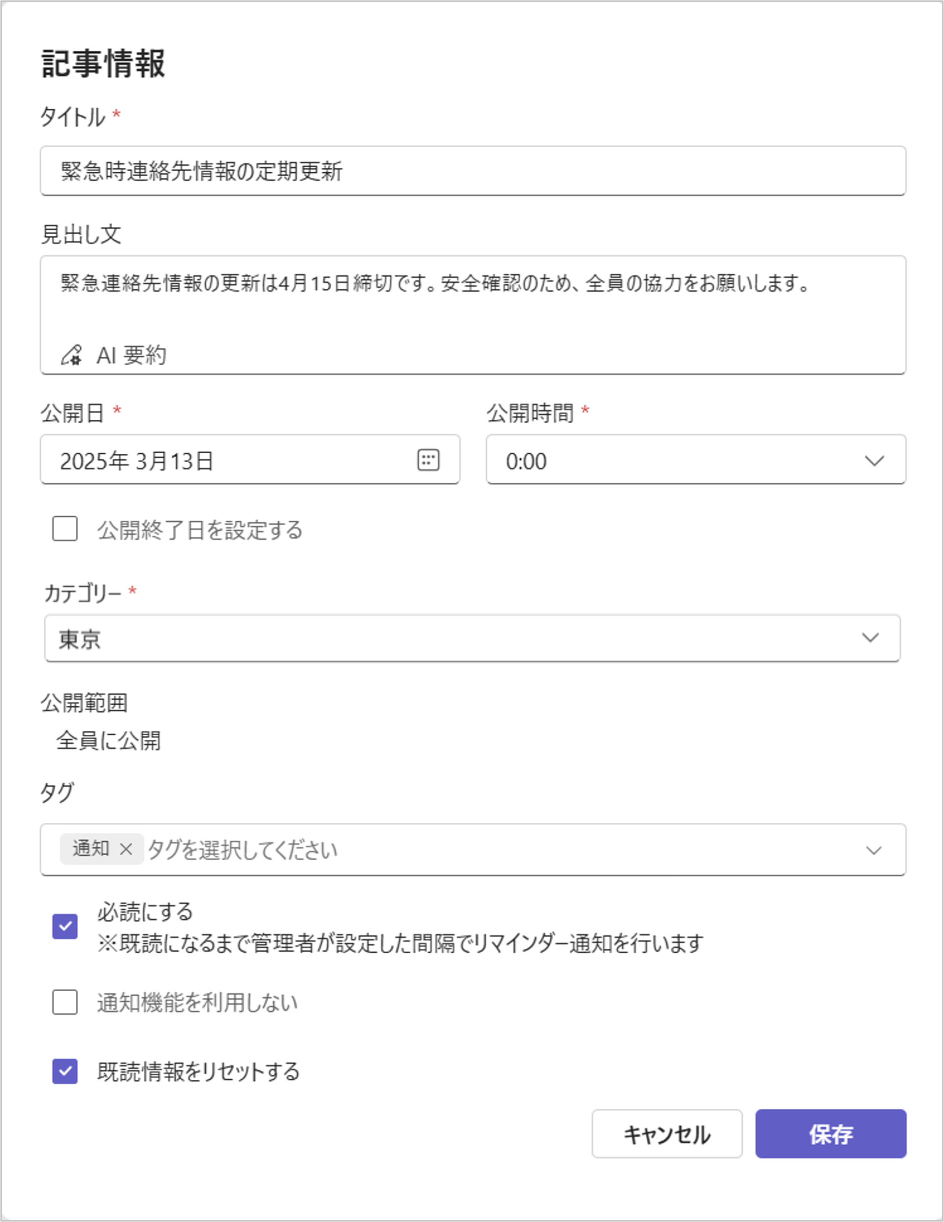 ※既読情報をリセットしない場合、すでに既読のユーザーには、アクティビティ通知は送信されません。 - 「記事情報」内の「投稿」ボタンをクリックします。