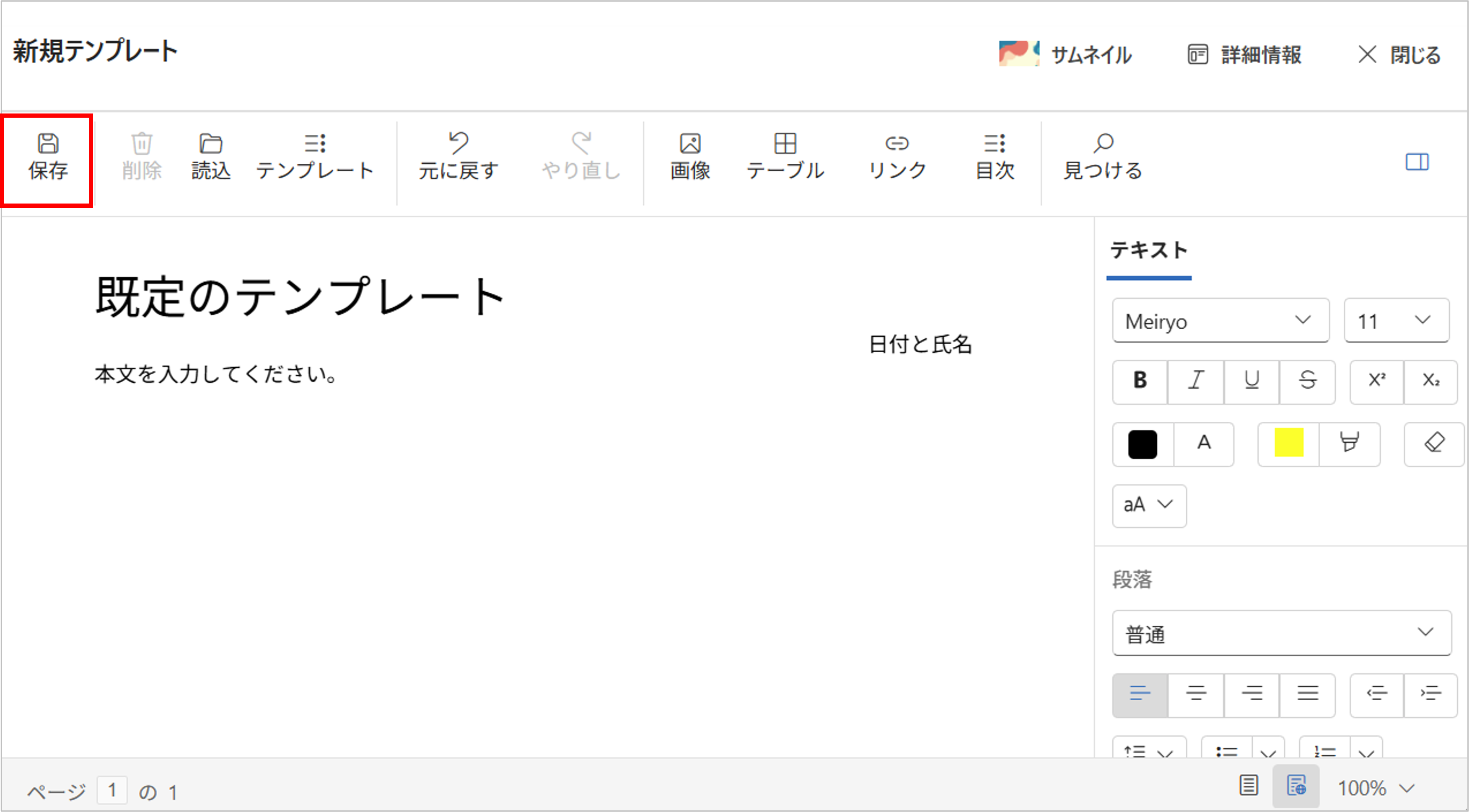 - テンプレートの編集完了後、画面左上の「保存」ボタンをクリックします。