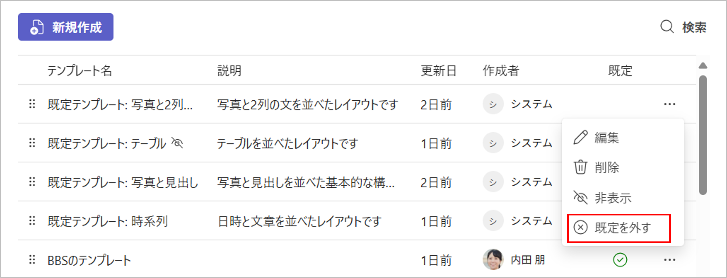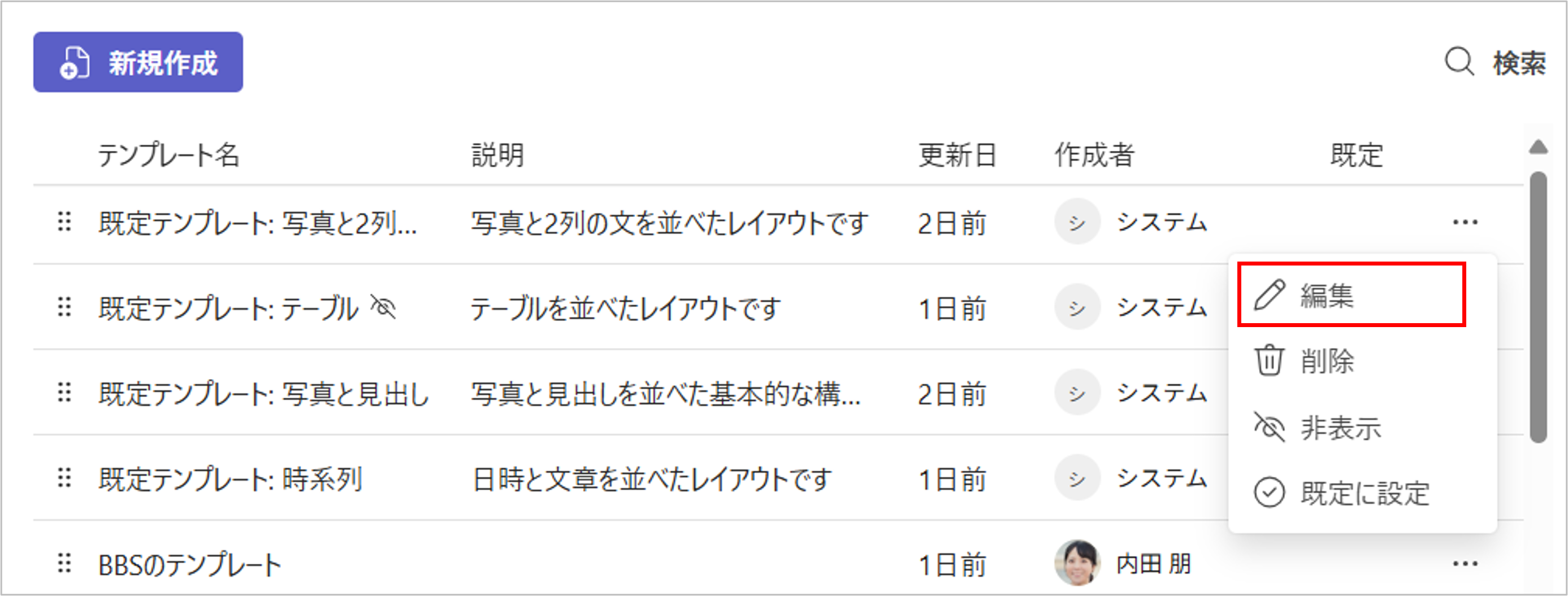 なお、「既定テンプレート」は編集や削除はできません。