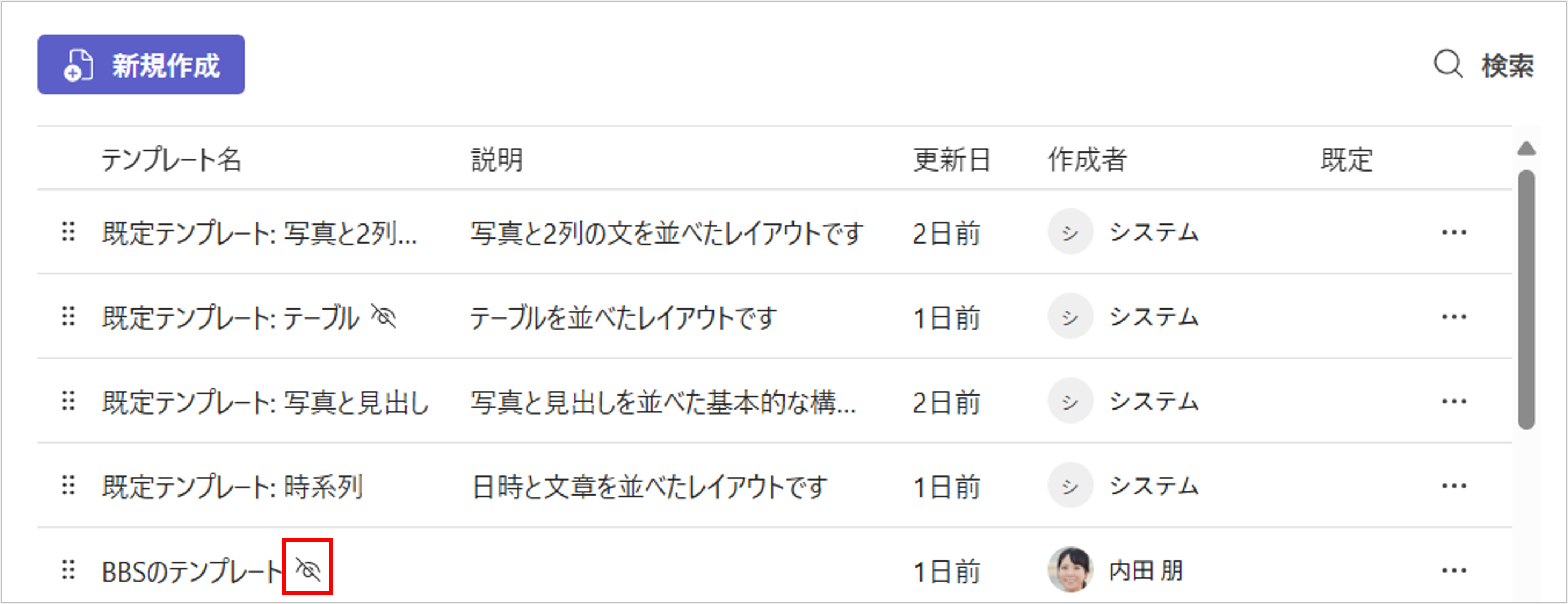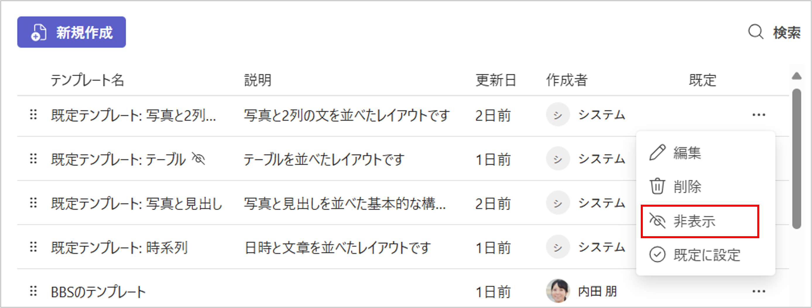 - テンプレート名の横に非表示のマークが表示され、非表示の設定が完了します。