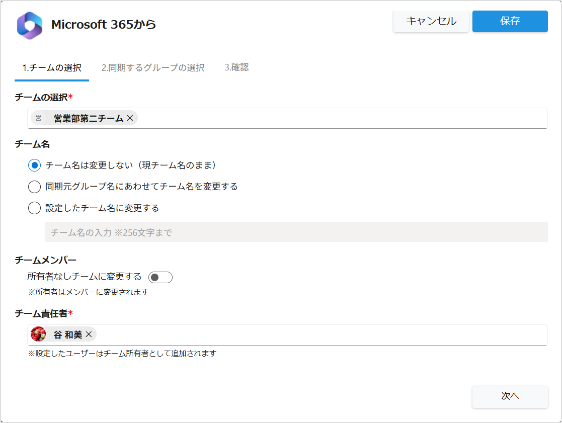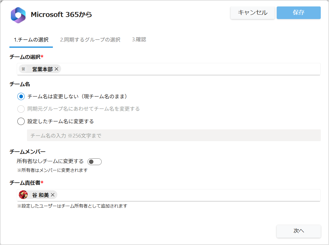 ※複数のグループをチームに同期する場合、「同期元グループ名にあわせてチーム名を変更する」を選択することはできません。チームメンバー 所有者なしチームに変更するかどうかを設定します。