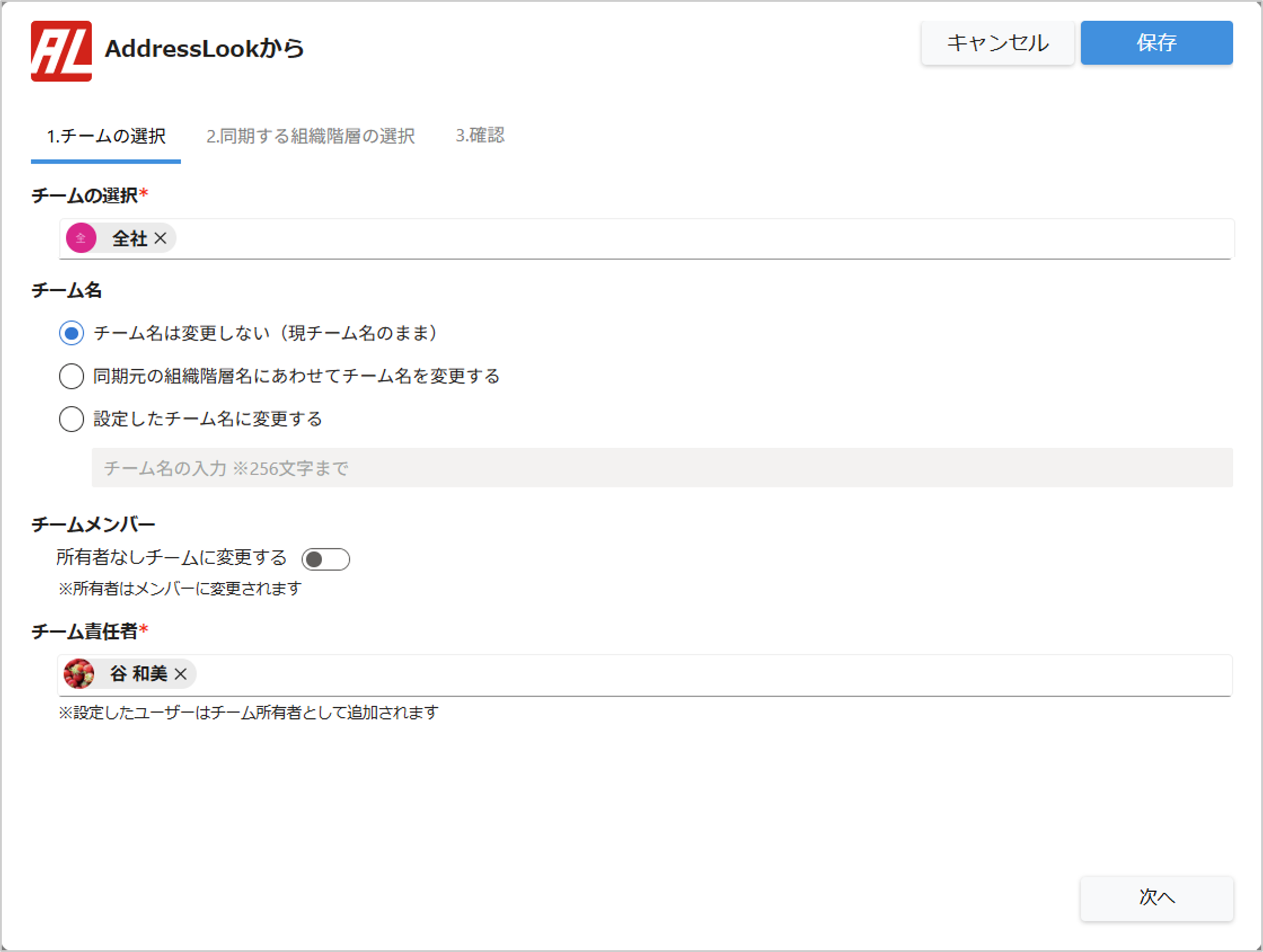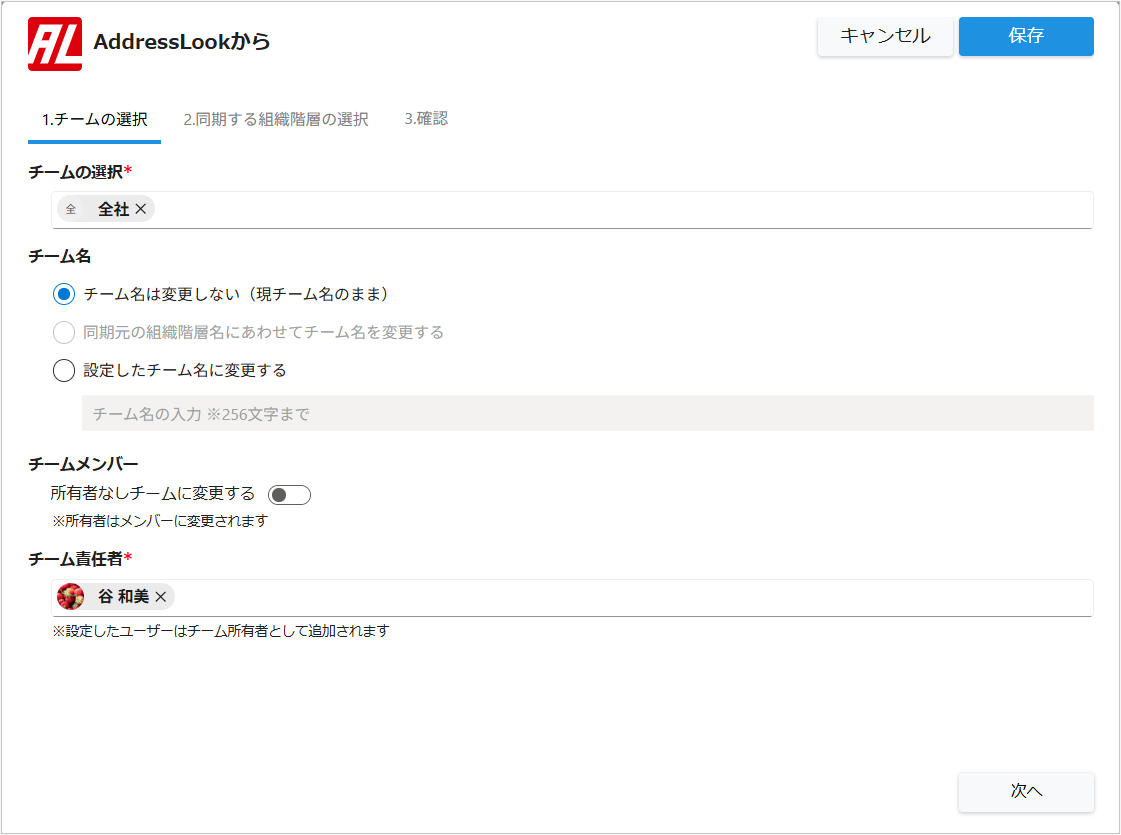 「チームの選択」タブの設定を行い、「次へ」をクリックします。