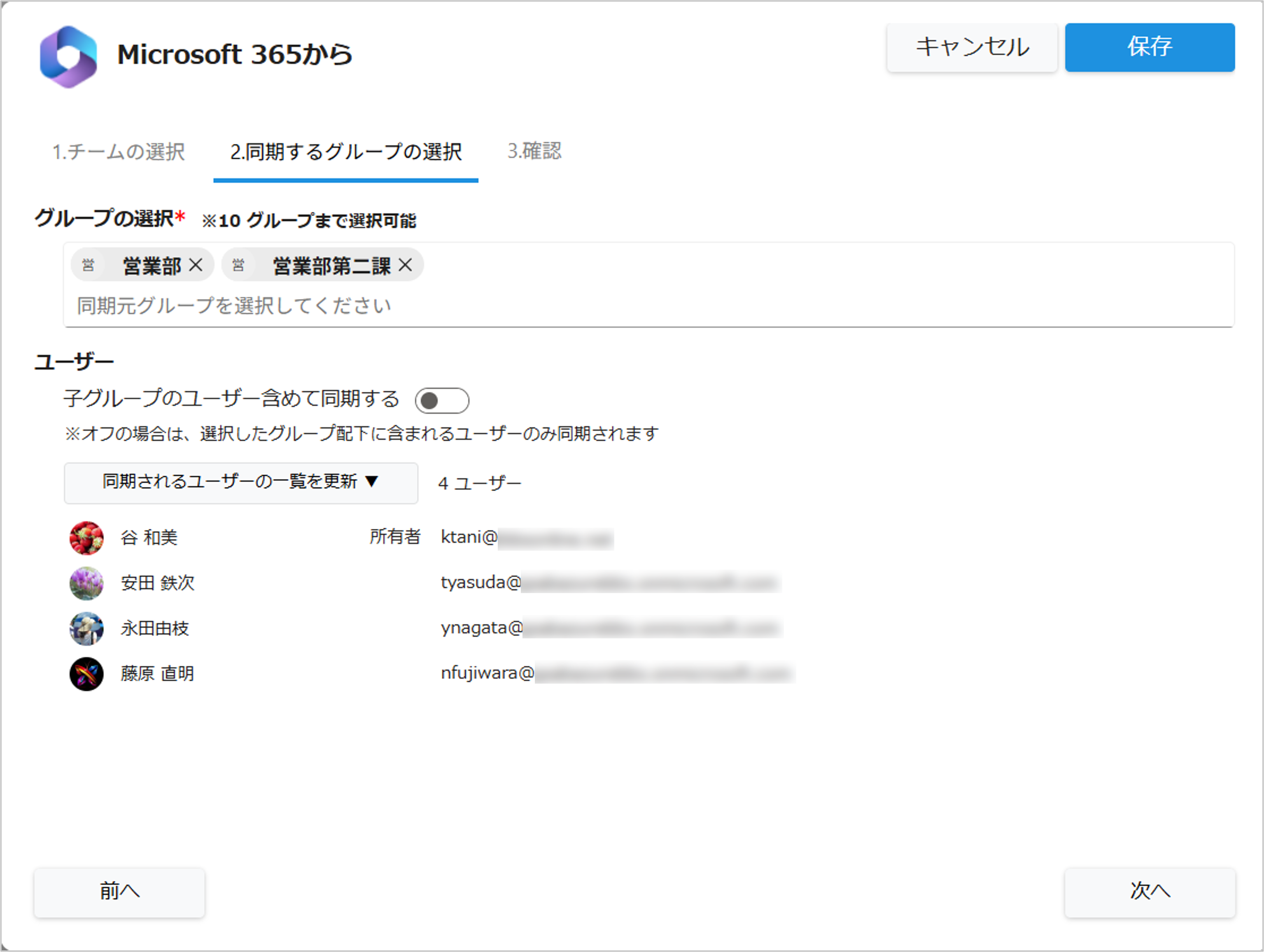テキストボックスに検索条件を入力すると、表示名・メールアドレスでグループを検索することができます。ユーザー 同期するユーザーを設定します。