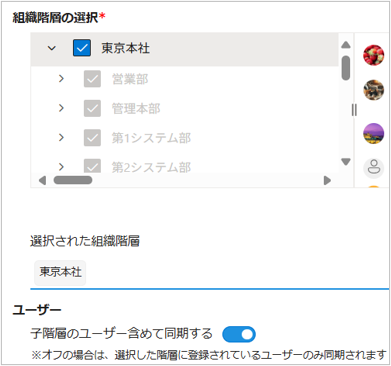 「子階層のユーザー含めて同期する」設定を有効にした場合、選択した階層に含まれる子階層のユーザーについても同期されます。