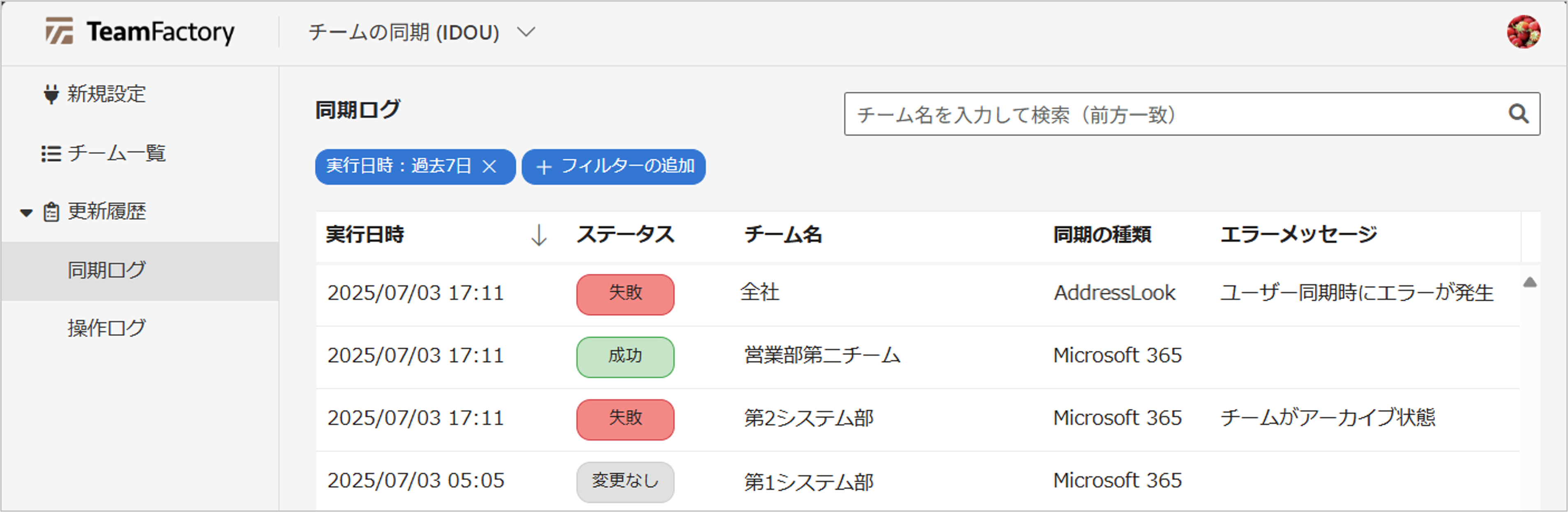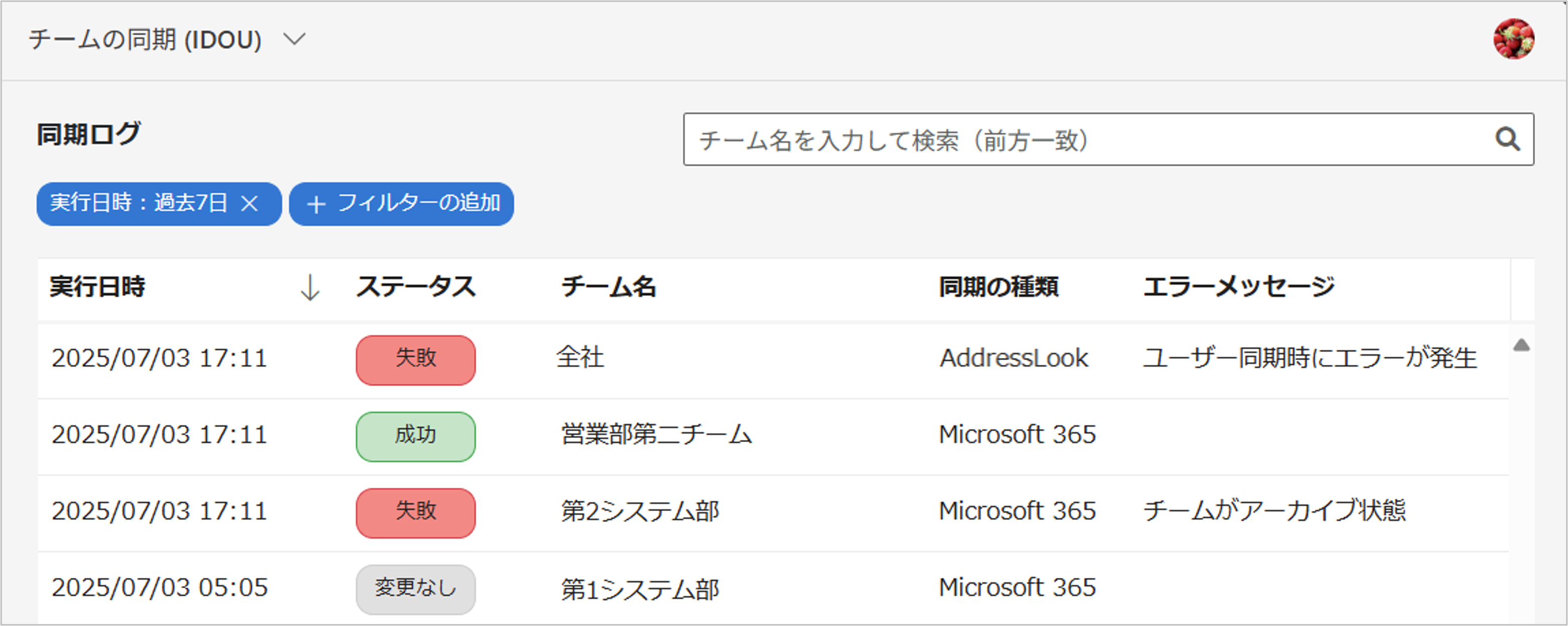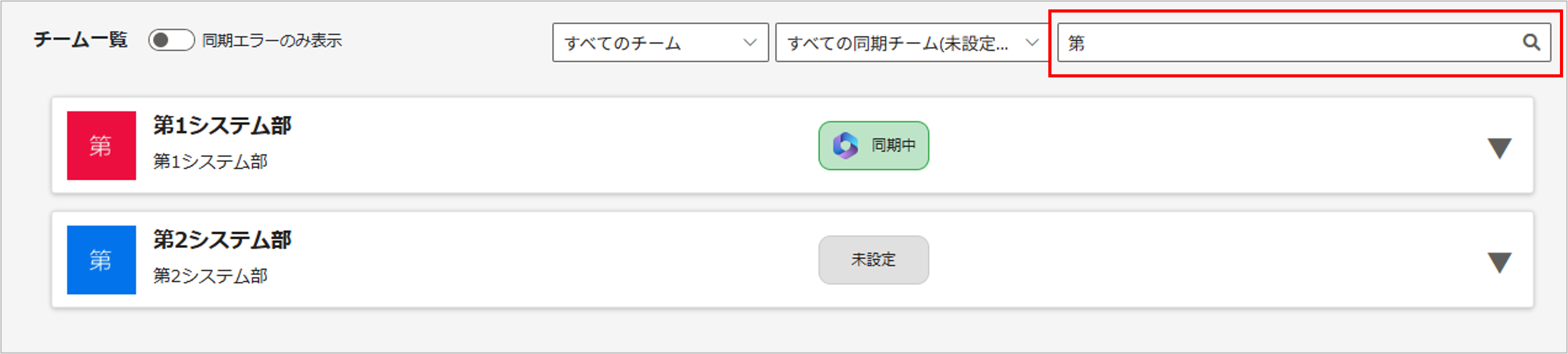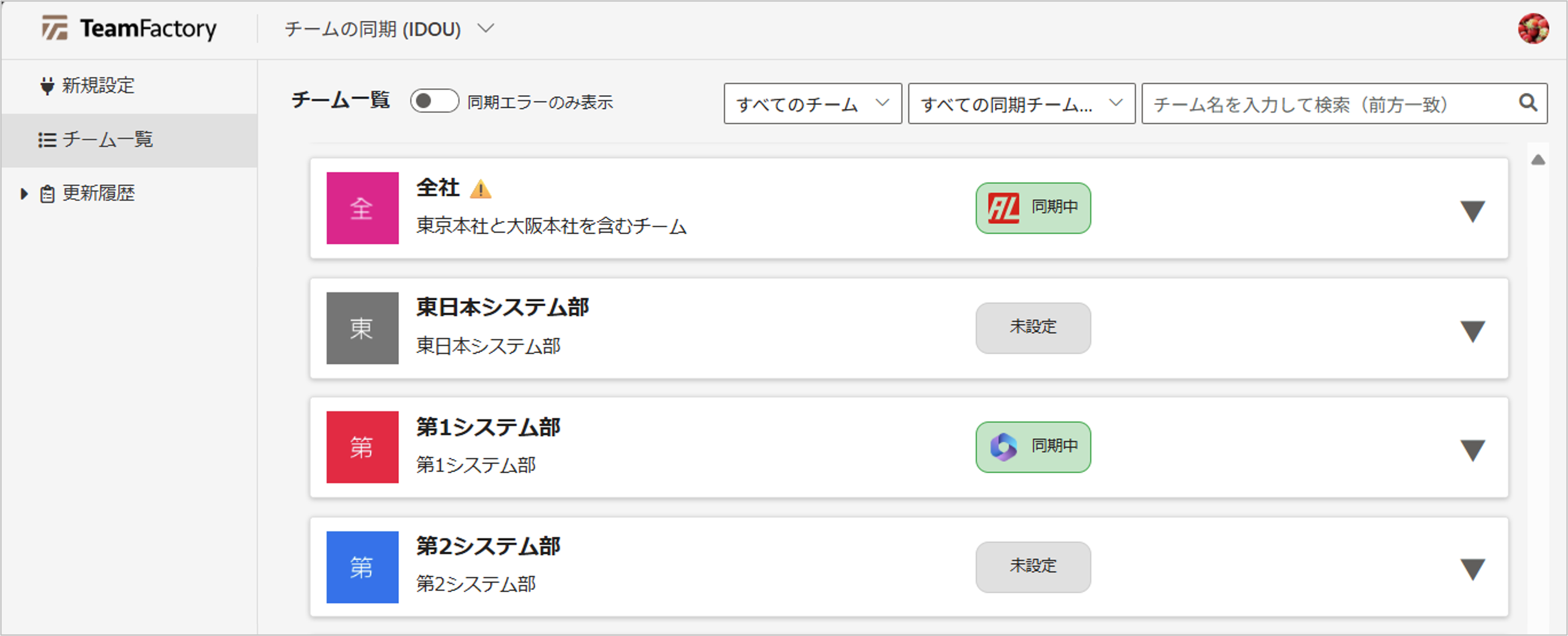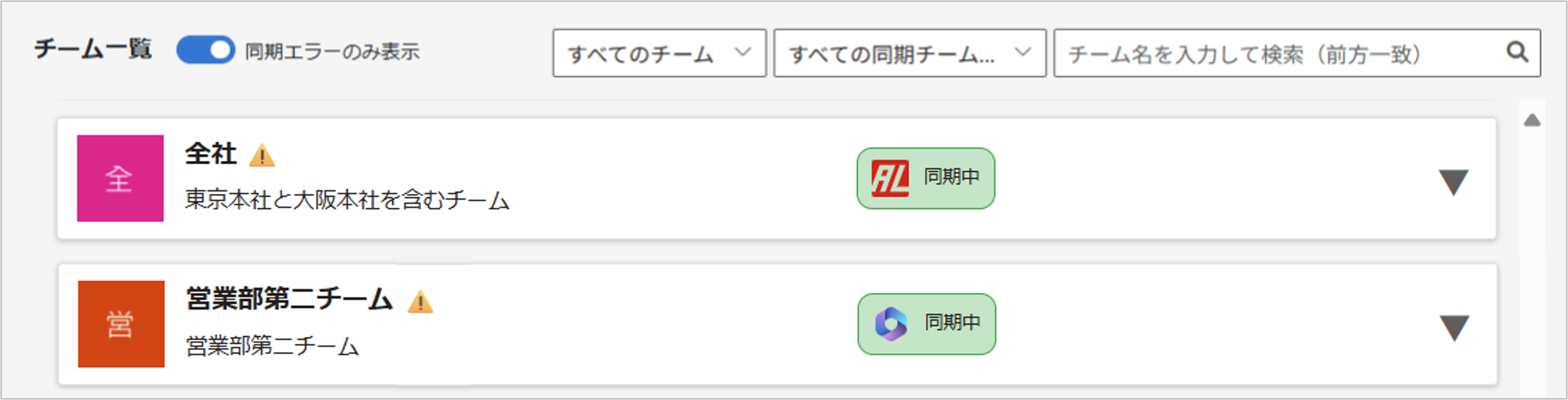 「同期エラーのみ表示」トグルをオンにすることで、同期エラーが発生しているチームのみ表示することができます。