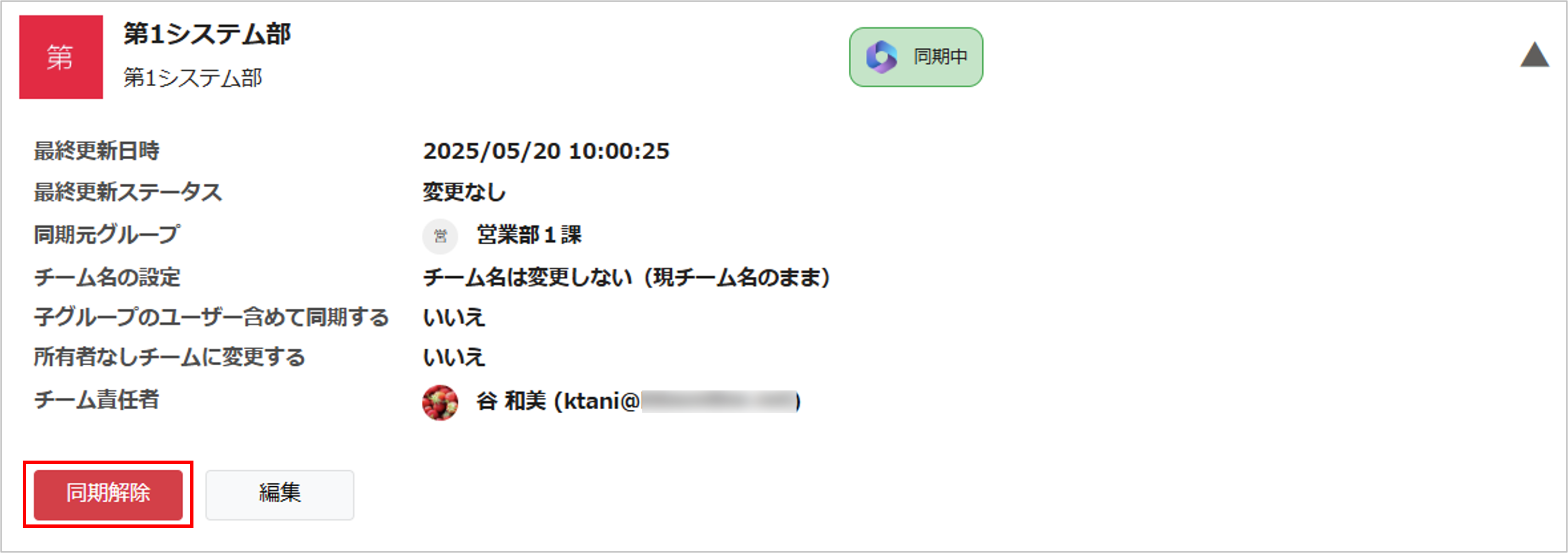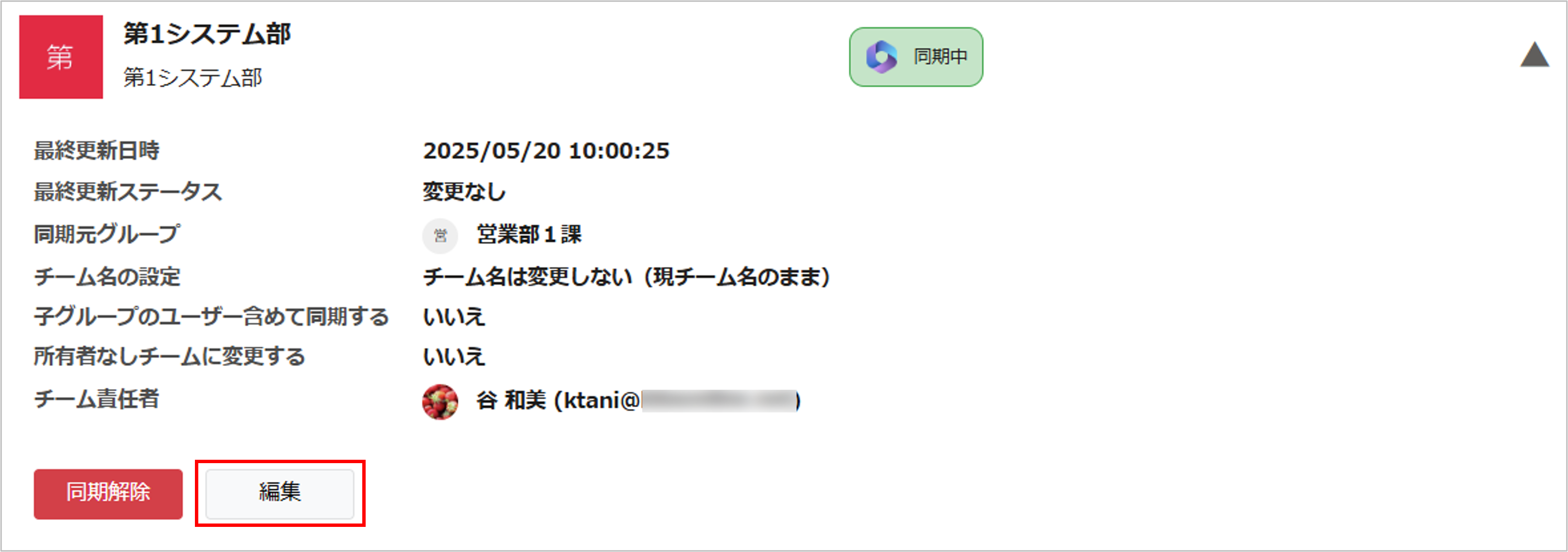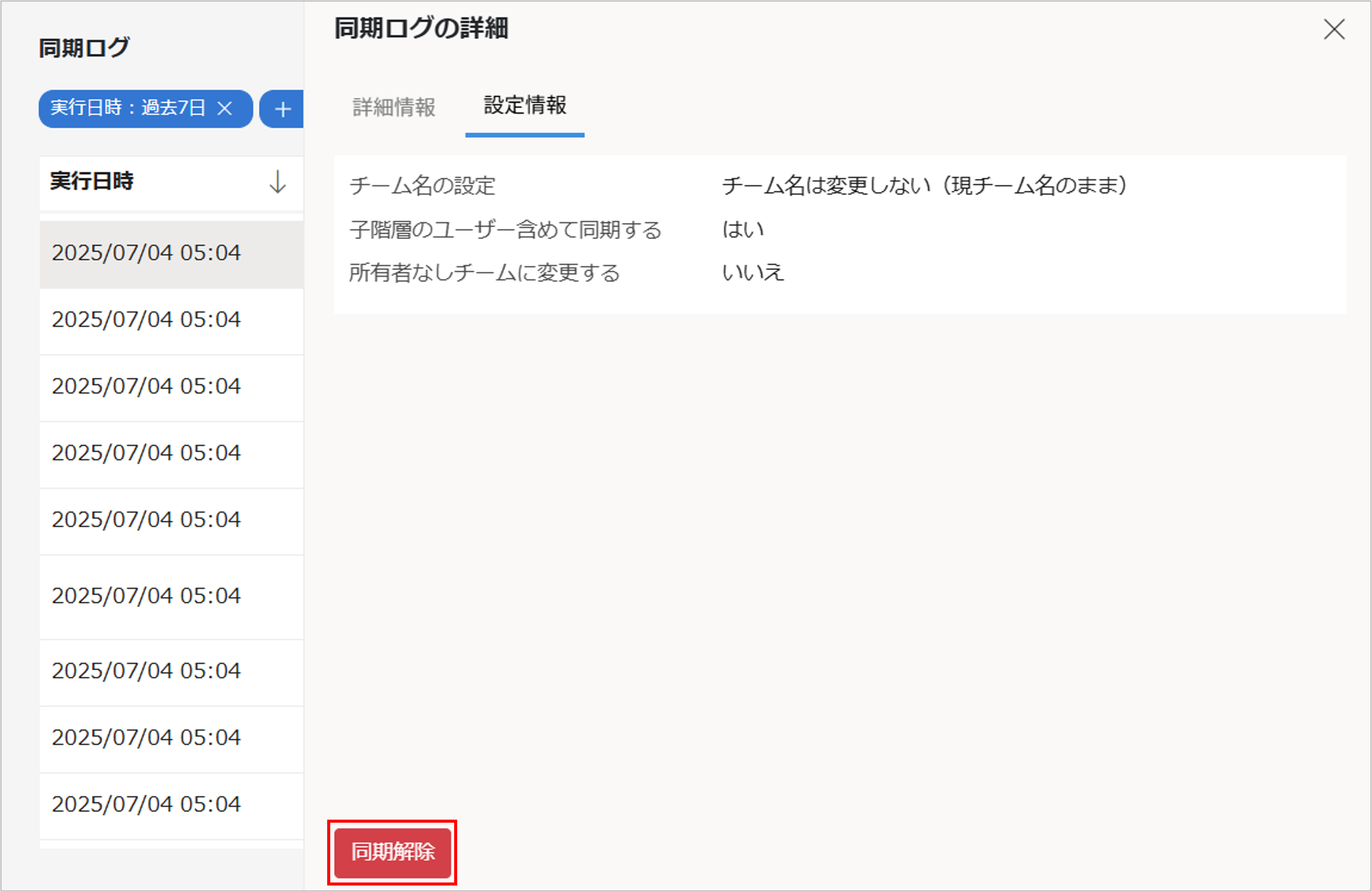 チーム一覧から同期中のチームをクリックすることで、同期の詳細設定情報を確認できます。