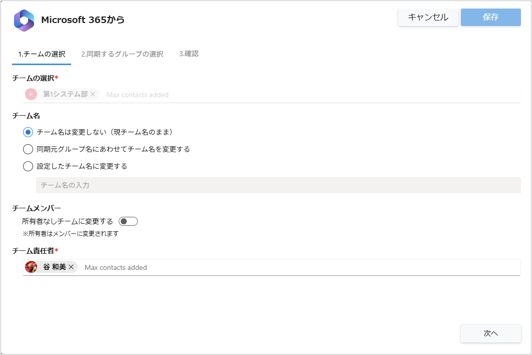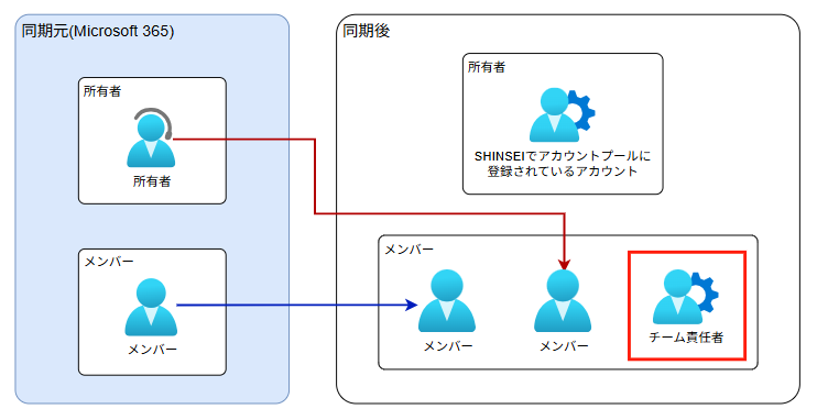※設定したチーム責任者は、同期元のグループに存在しているかどうかにかかわらず、同期後のチームに追加されます。- 所有者ありチームの場合: