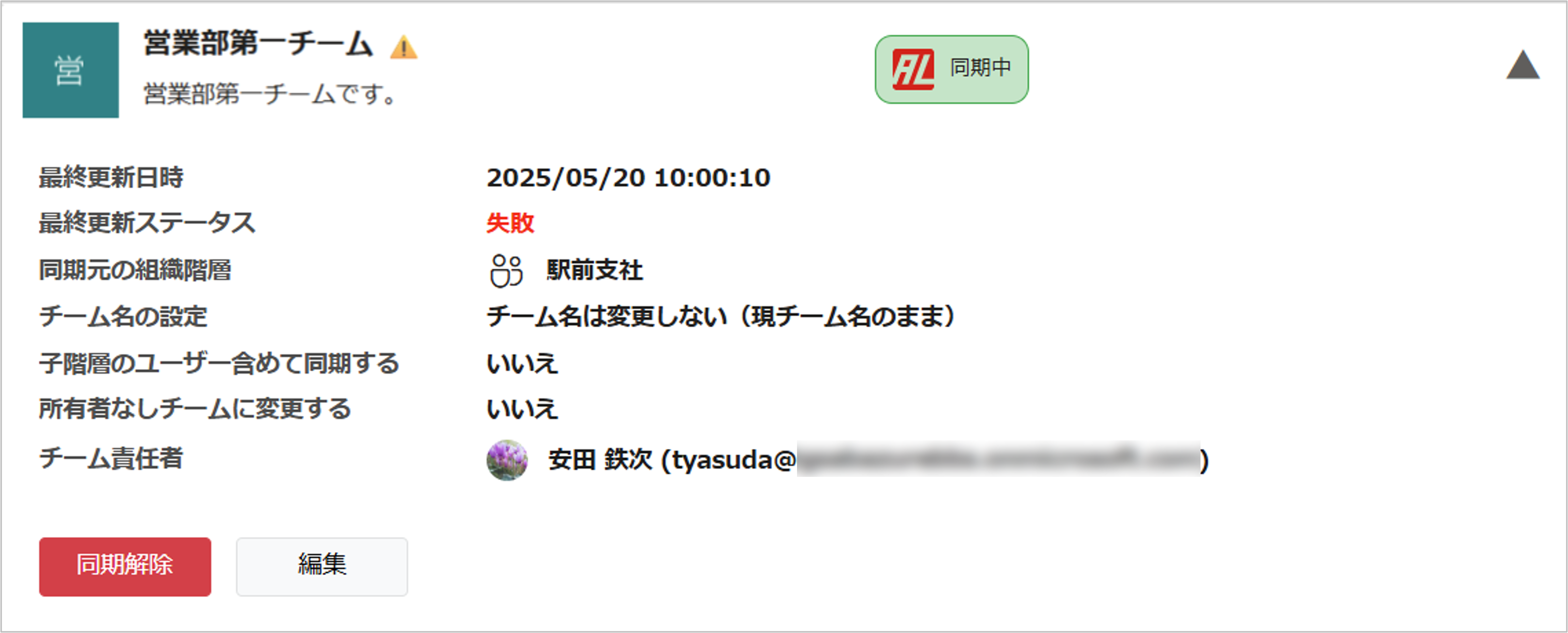 ステータスが「失敗」となっているチームは、チーム一覧から同期を解除することができます。