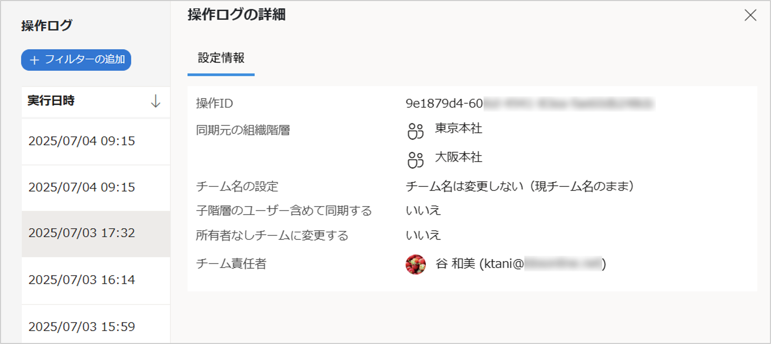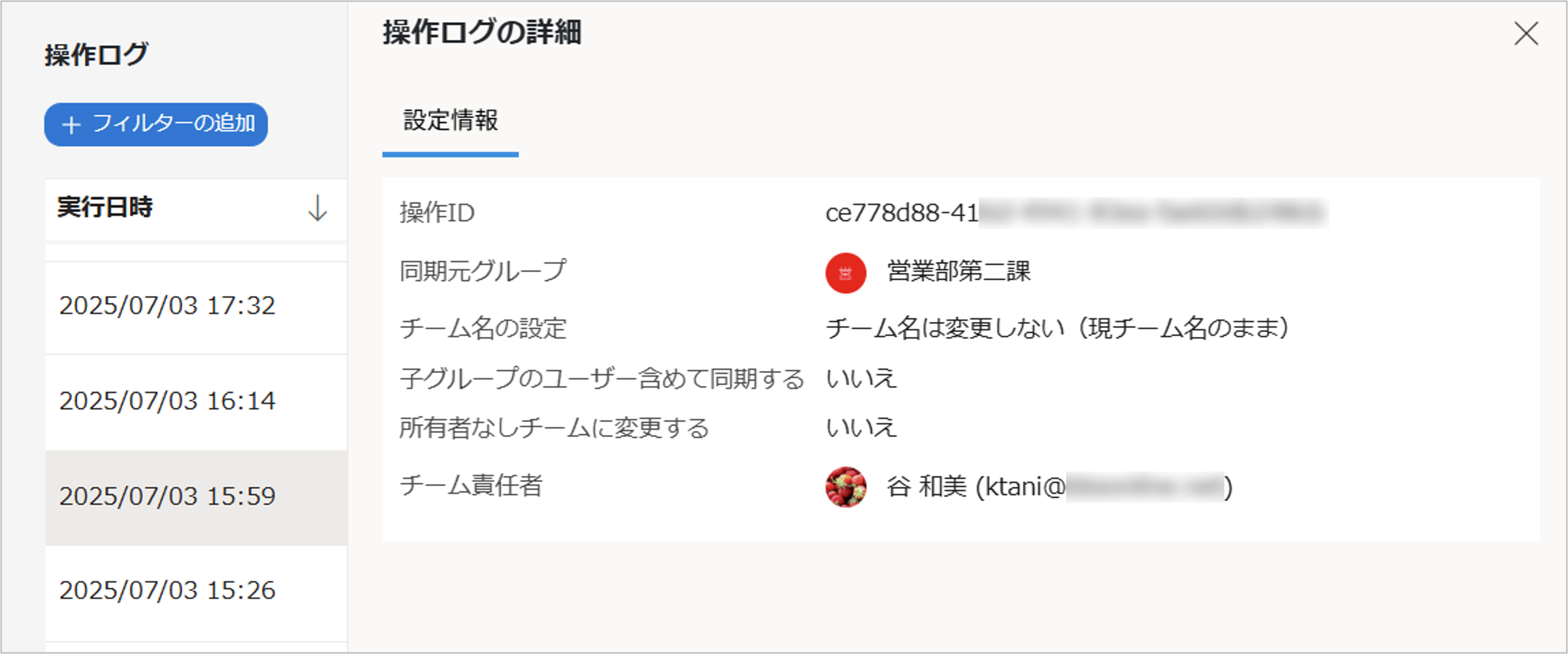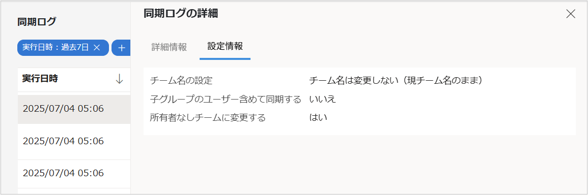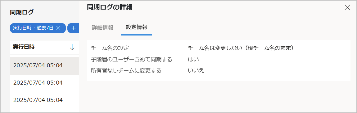 同期ログの一覧でチームをクリックすると詳細情報を確認することができます。