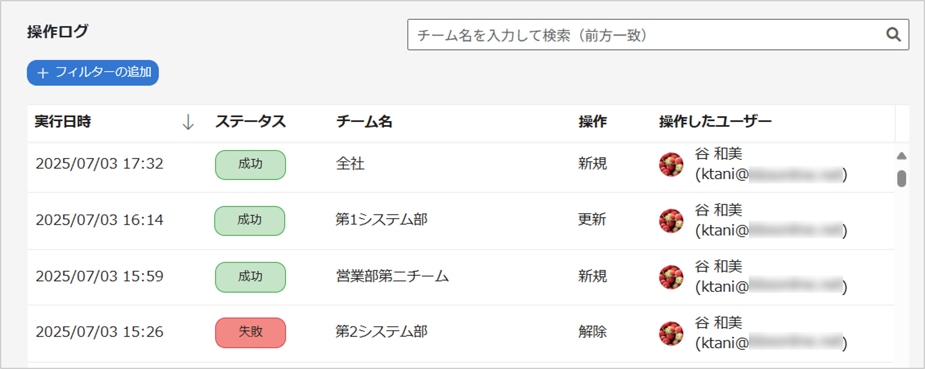 | 内容 | 実行された操作の内容を表示します。 (例):項目が「ユーザー追加」の場合、内容には対象ユーザーが表示されます。 |