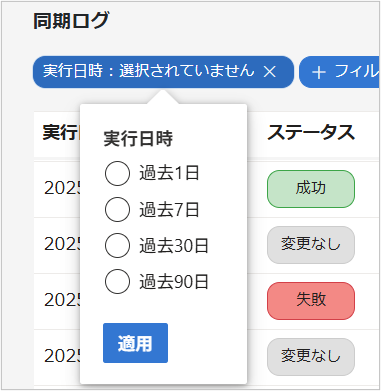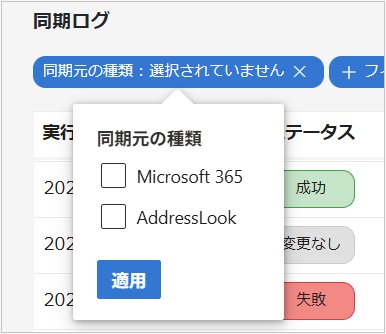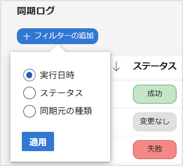 | 同期元の種類 | 同期元の種類でフィルターを設定します。 追加したフィルターをクリックし、同期元の種類を選択後に「適用」ボタンをクリックすることで、フィルターを適用できます。 ![]() |