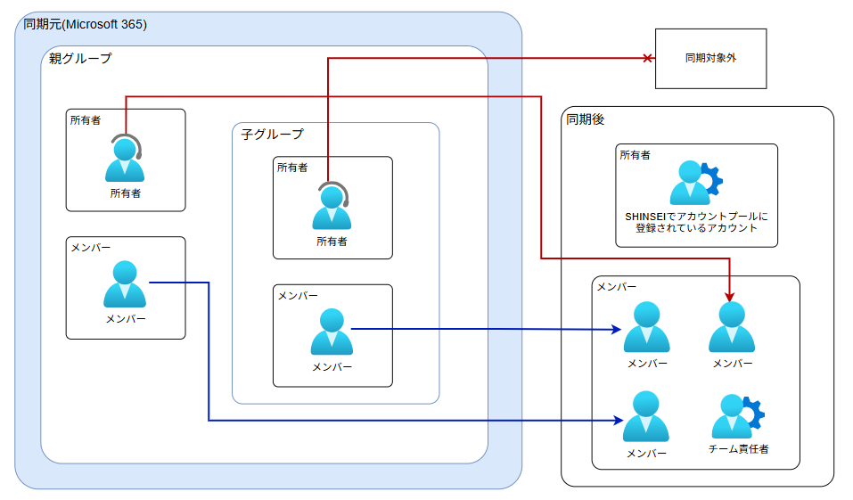 同期元のグループが入れ子の場合、子グループの所有者は同期対象外となります。